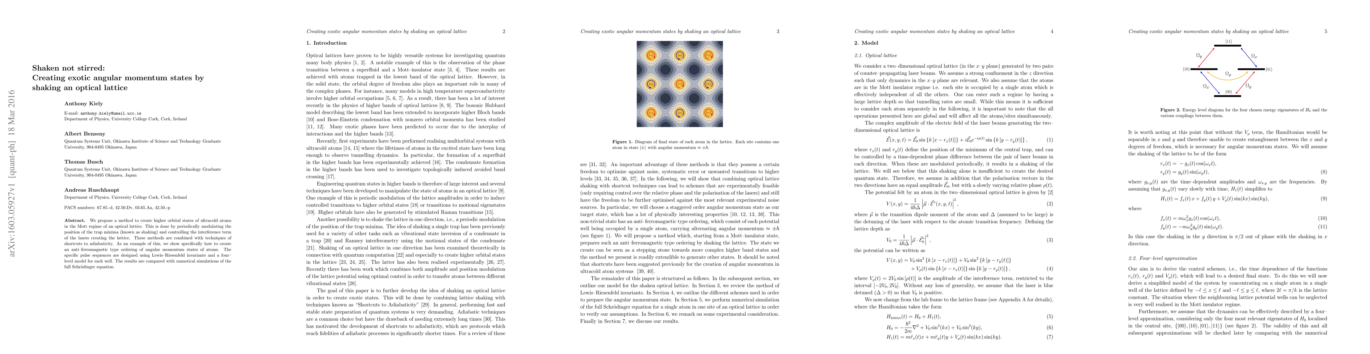 We propose a method to create higher orbital states of ultracold atoms in the Mott regime of an optical lattice. This is done by periodically modulating the position of the trap minima (known as shaking) and controlling the interference term of the lasers creating the lattice. These methods are combined with techniques of shortcuts to adiabaticity. As an example of this, we show specifically how to create an anti-ferromagnetic type ordering of angular momentum states of atoms. The specific pulse sequences are designed using Lewis-Riesenfeld invariants and a four-level model for each well. The results are compared with numerical simulations of the full Schroedinger equation.