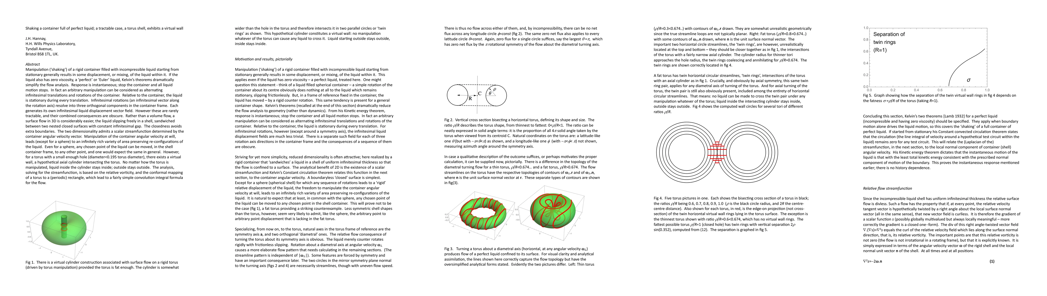 Manipulation ('shaking') of a rigid container filled with incompressible liquid starting from stationary generally results in some displacement, or mixing, of the liquid within it. If the liquid also has zero viscosity, a 'perfect', or Euler liquid, Kelvin's theorems dramatically simplify the flow analysis. Response is instantaneous; stop the container and all liquid motion stops. In fact an arbitrary manipulation can be considered as alternating infinitesimal translations snd rotations of the container. Relative to the container, the liquid is stationary during every translation. Infinitesimal rotations (an infinitesimal vector along the rotation axis) resolve into three orthogonal components in the container frame. Each generates its own infinitesimal liquid displacement vector field. However these are rarely tractable, and their combined consequences are obscure. Rather than a volume flow, a surface flow in 3D is considerably easier, the liquid slipping freely in a shell, sandwiched between two nested closed surfaces with constant infinitesimal gap. The closedness avoids extra boundaries. The two dimensionality admits a scalar streamfunction determined by the container angular velocity vector. Manipulation of the container angular velocity at will, leads (except for a sphere) to an infinitely rich variety of area preserving re-configurations of the liquid. Even for a sphere, any chosen point of the liquid can be moved, in the shell container frame, to any other point, and one would expect the same in general. However, for torus with a small enough hole (diameter<0.195 torus diameter), there exists a virtual wall, a hypothetical axial cylinder intersecting the torus. No matter how the torus is manipulated, liquid inside the cylinder stays inside; outside stays outside.