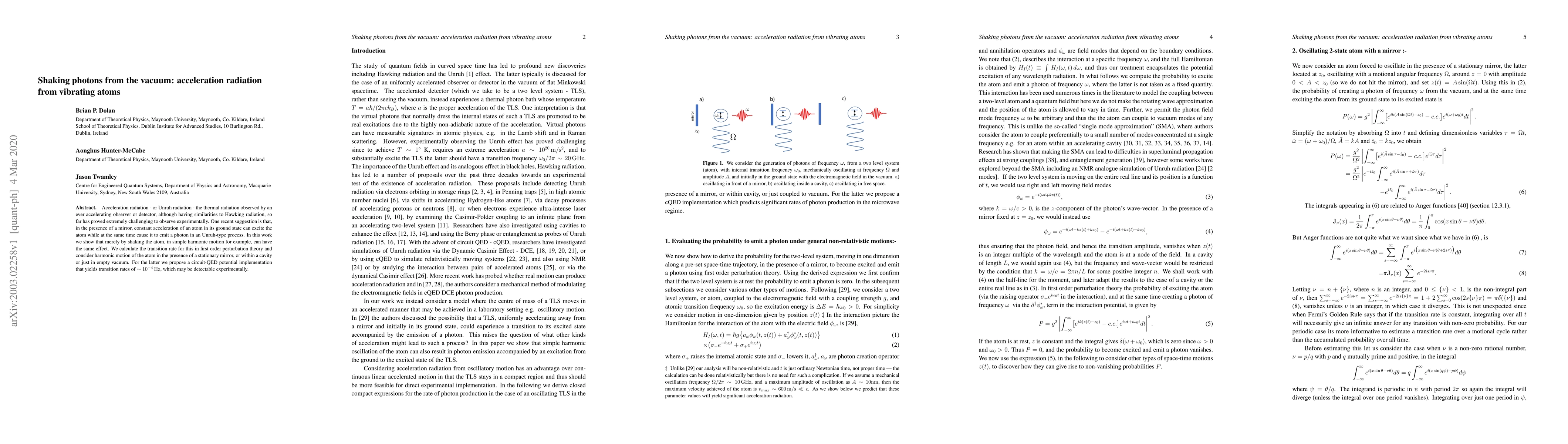 Acceleration radiation - or Unruh radiation - the thermal radiation observed by an ever accelerating observer or detector, although having similarities to Hawking radiation, so far has proved extremely challenging to observe experimentally. One recent suggestion is that, in the presence of a mirror, constant acceleration of an atom in its ground state can excite the atom while at the same time cause it to emit a photon in an Unruh-type process. In this work we show that merely by shaking the atom, in simple harmonic motion for example, can have the same effect. We calculate the transition rate for this in first order perturbation theory and consider harmonic motion of the atom in the presence of a stationary mirror, or within a cavity or just in empty vacuum. For the latter we propose a circuit-QED potential implementation that yields transition rates of $\sim 10^{-4}\,{\rm Hz}$, which may be detectable experimentally.