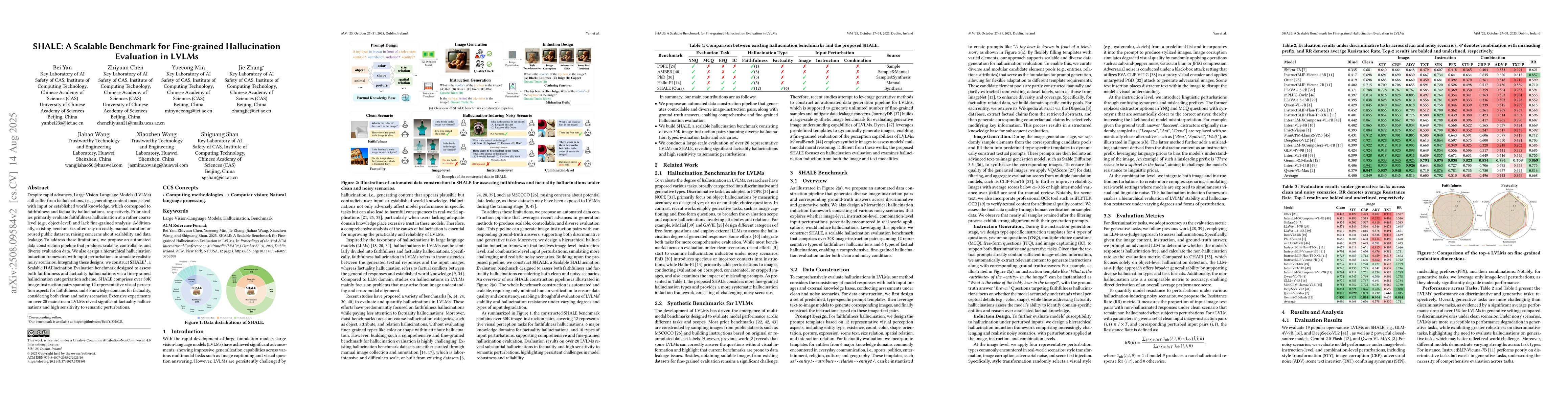 Despite rapid advances, Large Vision-Language Models (LVLMs) still suffer from hallucinations, i.e., generating content inconsistent with input or established world knowledge, which correspond to faithfulness and factuality hallucinations, respectively. Prior studies primarily evaluate faithfulness hallucination at a rather coarse level (e.g., object-level) and lack fine-grained analysis. Additionally, existing benchmarks often rely on costly manual curation or reused public datasets, raising concerns about scalability and data leakage. To address these limitations, we propose an automated data construction pipeline that produces scalable, controllable, and diverse evaluation data. We also design a hierarchical hallucination induction framework with input perturbations to simulate realistic noisy scenarios. Integrating these designs, we construct SHALE, a Scalable HALlucination Evaluation benchmark designed to assess both faithfulness and factuality hallucinations via a fine-grained hallucination categorization scheme. SHALE comprises over 30K image-instruction pairs spanning 12 representative visual perception aspects for faithfulness and 6 knowledge domains for factuality, considering both clean and noisy scenarios. Extensive experiments on over 20 mainstream LVLMs reveal significant factuality hallucinations and high sensitivity to semantic perturbations.