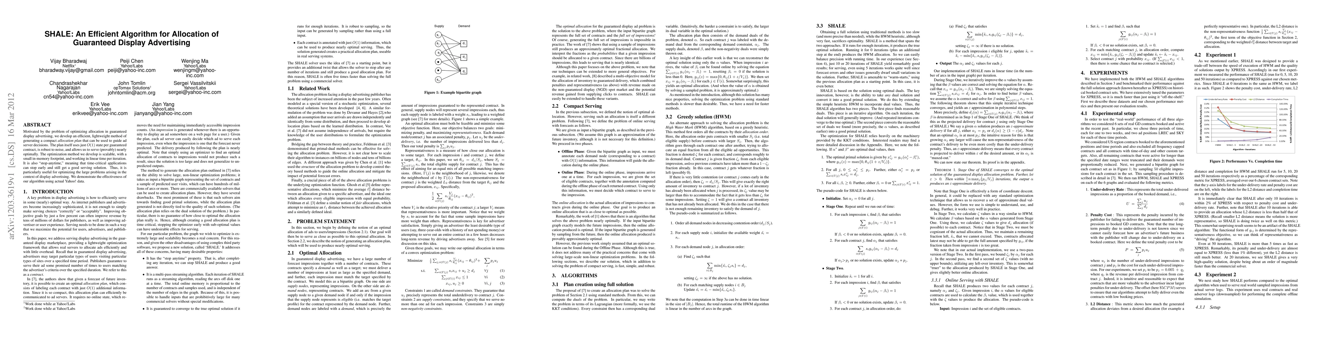 The SHALE algorithm efficiently generates a compact allocation plan for optimizing guaranteed display advertising, offering O(1) state per contract, robustness to noise, and nearly optimal serving. It is scalable, operates in linear time per iteration, and can be stopped early for timely solutions, demonstrated effective with Yahoo! data.