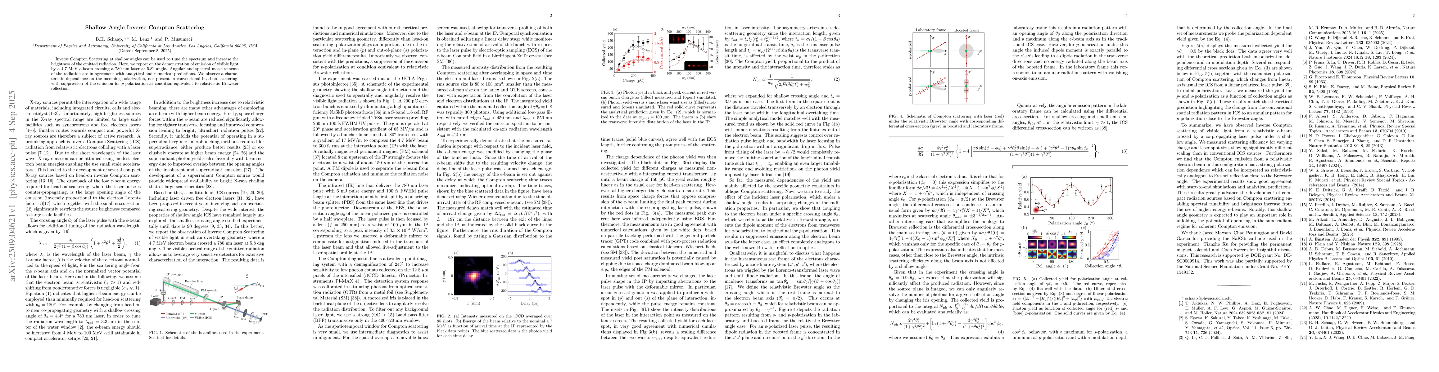 Inverse Compton Scattering at shallow angles can be used to tune the spectrum and increase the brightness of the emitted radiation. Here, we report on the demonstration of emission of visible light by a 4.7 MeV $e$-beam crossing a 780 nm laser at 5.8$^{\rm o}$ angle. Angular and spectral measurements of the radiation are in agreement with analytical and numerical predictions. We observe a characteristic dependence on the incoming polarization, not present in conventional head-on scattering, with suppression of the emission for $p$-polarization at condition equivalent to relativistic Brewster reflection.