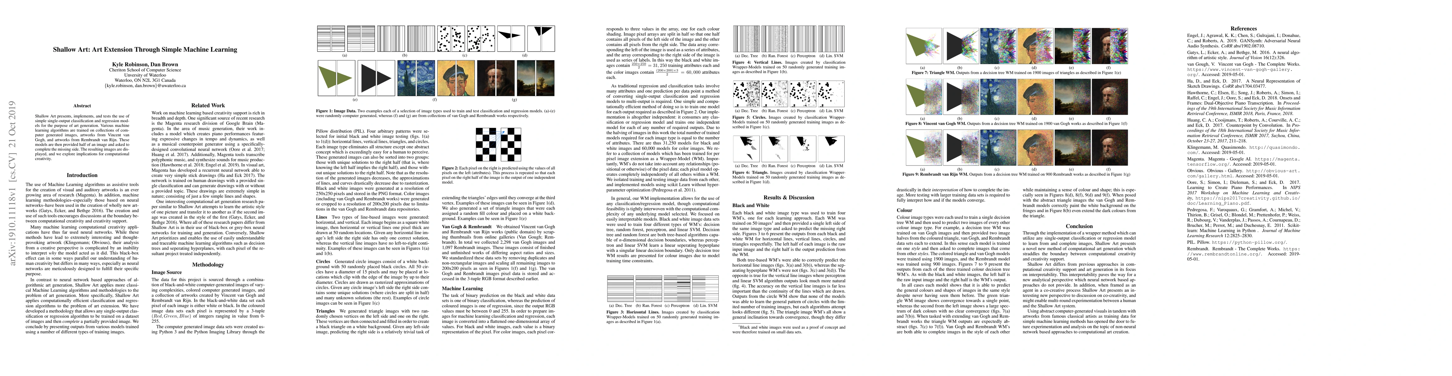 Shallow Art presents, implements, and tests the use of simple single-output classification and regression models for the purpose of art generation. Various machine learning algorithms are trained on collections of computer generated images, artworks from Vincent van Gogh, and artworks from Rembrandt van Rijn. These models are then provided half of an image and asked to complete the missing side. The resulting images are displayed, and we explore implications for computational creativity.