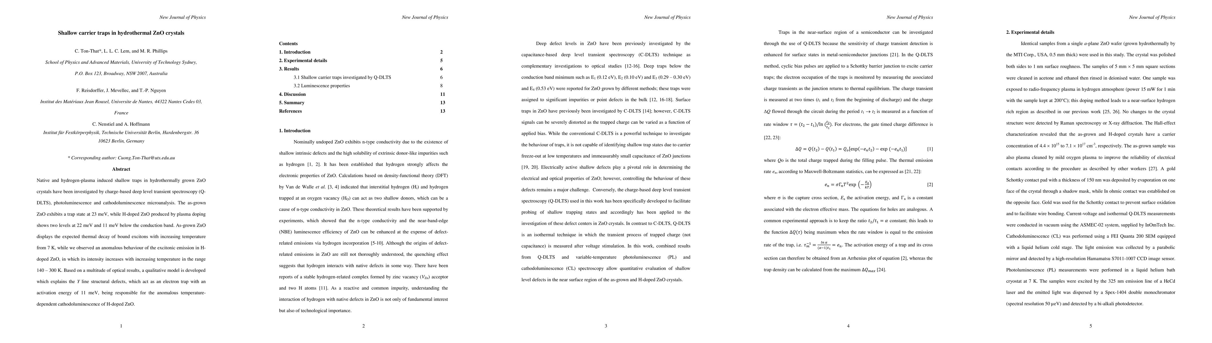 Native and hydrogen-plasma induced shallow traps in hydrothermally grown ZnO crystals have been investigated by charge-based deep level transient spectroscopy (Q-DLTS), photoluminescence and cathodoluminescence microanalysis. The as-grown ZnO exhibits a trap state at 23 meV, while H-doped ZnO produced by plasma doping shows two levels at 22 meV and 11 meV below the conduction band. As-grown ZnO displays the expected thermal decay of bound excitons with increasing temperature from 7 K, while we observed an anomalous behaviour of the excitonic emission in H-doped ZnO, in which its intensity increases with increasing temperature in the range 140-300 K. Based on a multitude of optical results, a qualitative model is developed which explains the Y line structural defects, which act as an electron trap with an activation energy of 11 meV, being responsible for the anomalous temperature-dependent cathodoluminescence of H-doped ZnO.