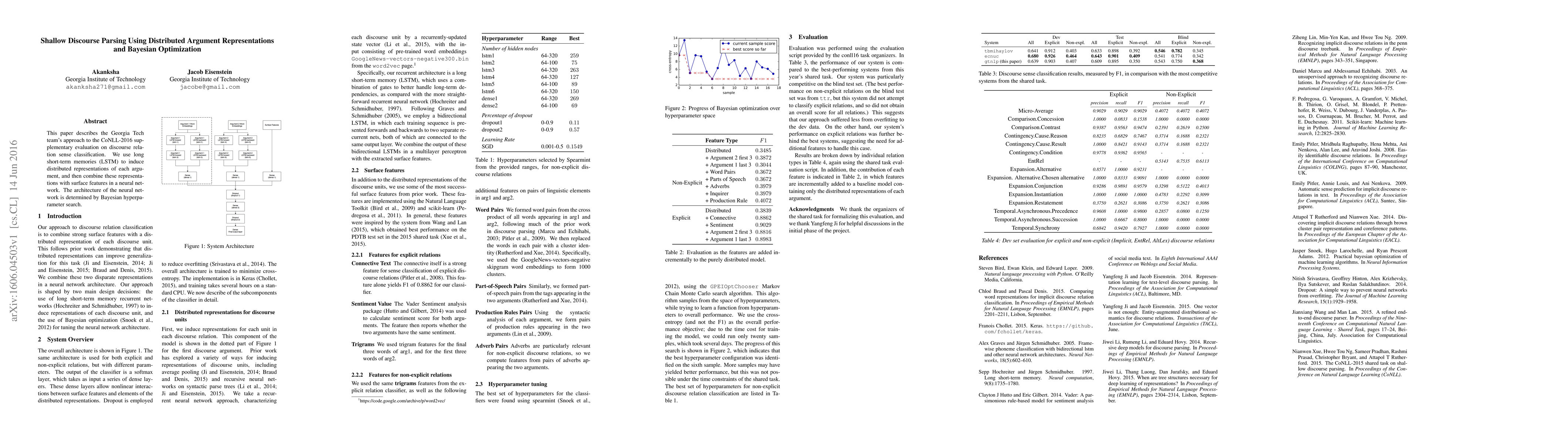This paper presents a method for shallow discourse parsing using LSTM-induced distributed representations of arguments combined with surface features in a neural network, with the architecture optimized via Bayesian hyperparameter search. The approach was applied to the CoNLL-2016 supplementary evaluation on discourse relation sense classification.