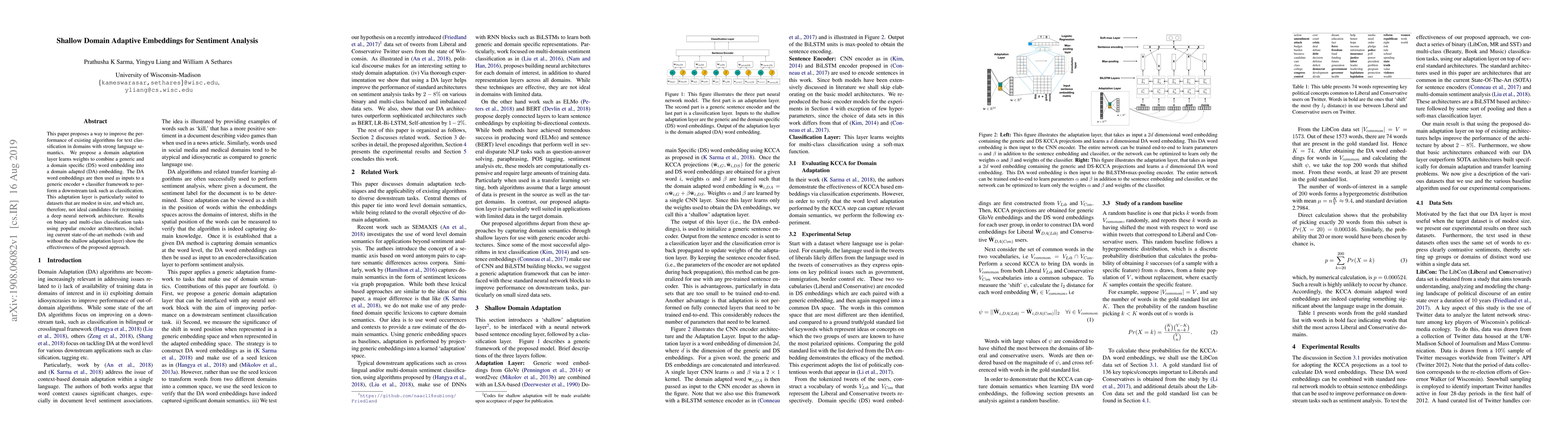 This paper proposes a way to improve the performance of existing algorithms for text classification in domains with strong language semantics. We propose a domain adaptation layer learns weights to combine a generic and a domain specific (DS) word embedding into a domain adapted (DA) embedding. The DA word embeddings are then used as inputs to a generic encoder + classifier framework to perform a downstream task such as classification. This adaptation layer is particularly suited to datasets that are modest in size, and which are, therefore, not ideal candidates for (re)training a deep neural network architecture. Results on binary and multi-class classification tasks using popular encoder architectures, including current state-of-the-art methods (with and without the shallow adaptation layer) show the effectiveness of the proposed approach.