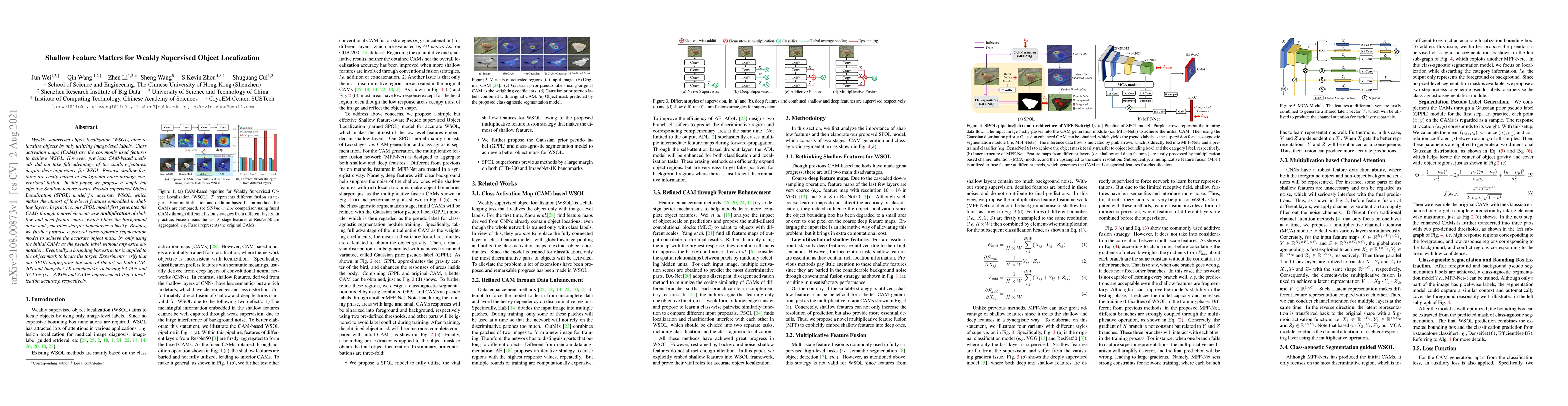 Weakly supervised object localization (WSOL) aims to localize objects by only utilizing image-level labels. Class activation maps (CAMs) are the commonly used features to achieve WSOL. However, previous CAM-based methods did not take full advantage of the shallow features, despite their importance for WSOL. Because shallow features are easily buried in background noise through conventional fusion. In this paper, we propose a simple but effective Shallow feature-aware Pseudo supervised Object Localization (SPOL) model for accurate WSOL, which makes the utmost of low-level features embedded in shallow layers. In practice, our SPOL model first generates the CAMs through a novel element-wise multiplication of shallow and deep feature maps, which filters the background noise and generates sharper boundaries robustly. Besides, we further propose a general class-agnostic segmentation model to achieve the accurate object mask, by only using the initial CAMs as the pseudo label without any extra annotation. Eventually, a bounding box extractor is applied to the object mask to locate the target. Experiments verify that our SPOL outperforms the state-of-the-art on both CUB-200 and ImageNet-1K benchmarks, achieving 93.44% and 67.15% (i.e., 3.93% and 2.13% improvement) Top-5 localization accuracy, respectively.