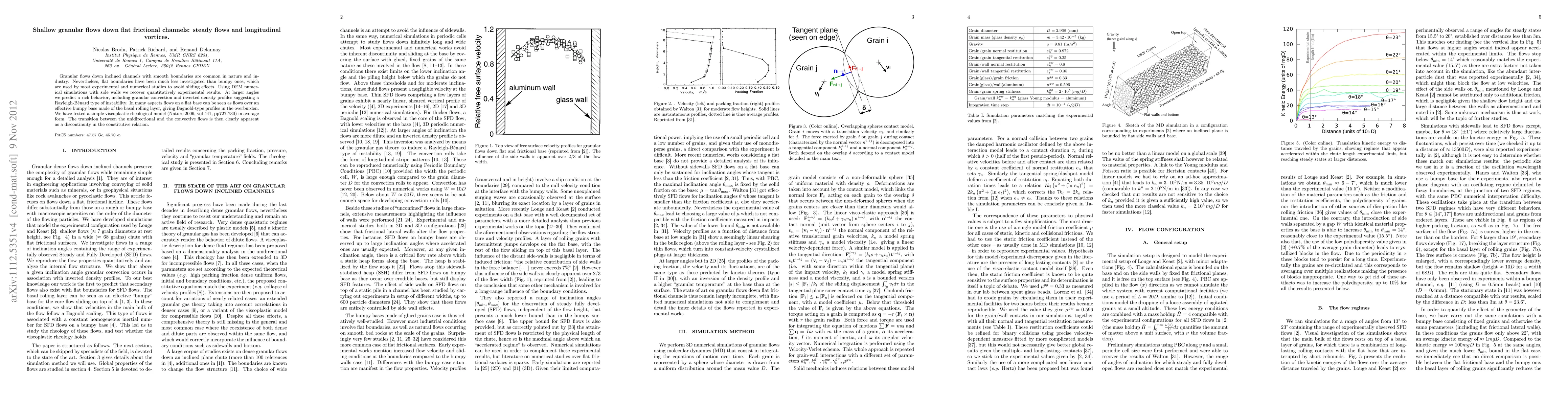 This paper investigates granular flows down flat frictional channels using DEM simulations, revealing complex behaviors such as granular convection and inverted density profiles at larger angles. The study shows that flows on flat bases exhibit Bagnold-type profiles due to a basal rolling layer, and transitions between unidirectional and convective flows are marked by discontinuities in the constitutive relation.