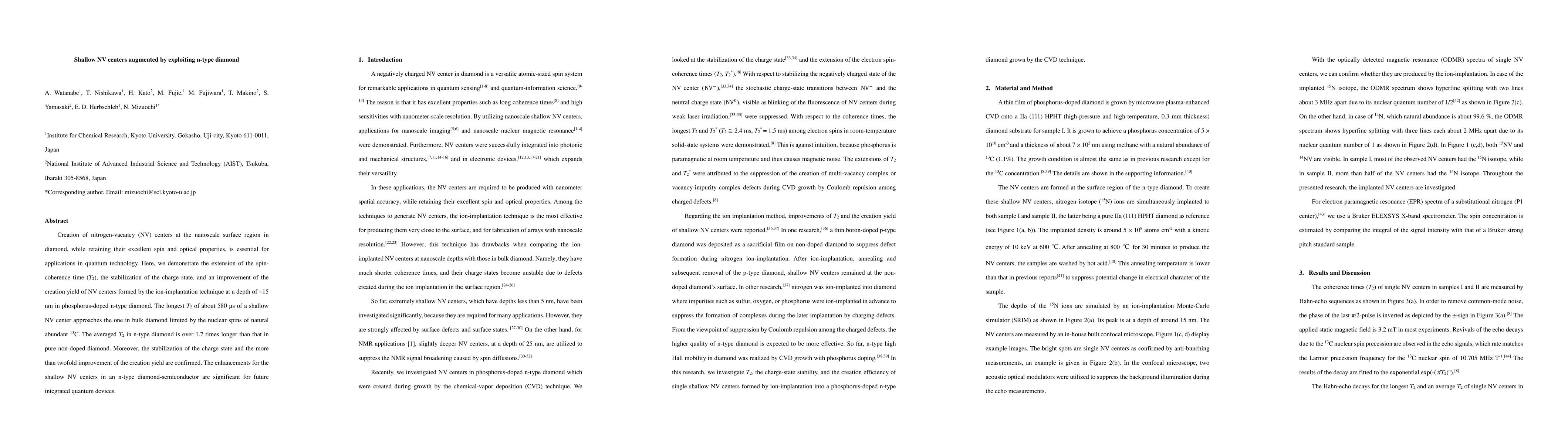 The creation of shallow NV centers at a depth of $ ilde{15}$ nm in phosphorus-doped n-type diamond using the ion-implantation technique.