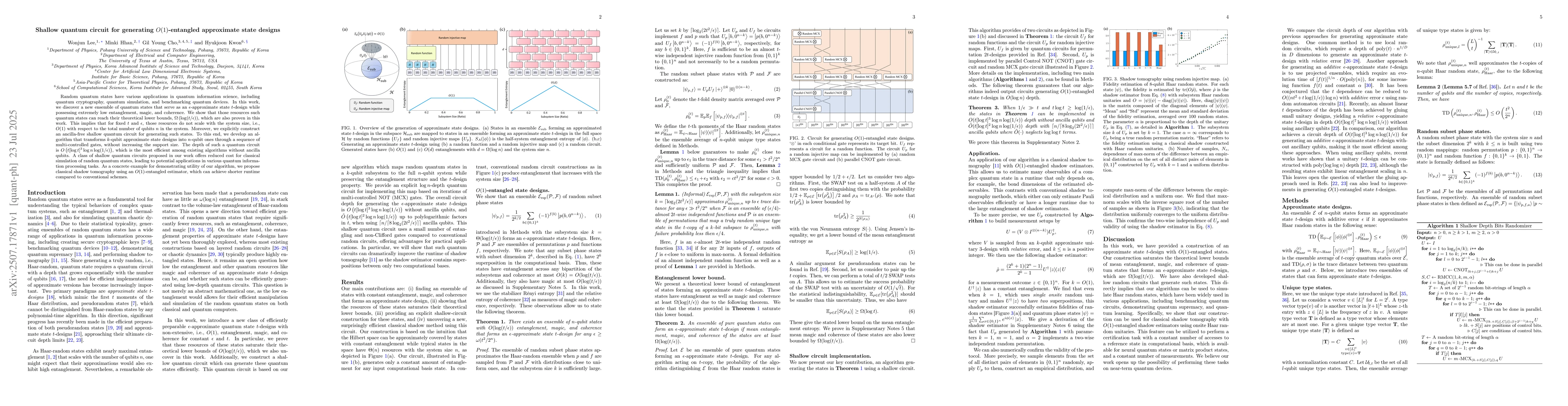 Random quantum states have various applications in quantum information science, including quantum cryptography, quantum simulation, and benchmarking quantum devices. In this work, we discover a new ensemble of quantum states that serve as an $\epsilon$-approximate state $t$-design while possessing extremely low entanglement, magic, and coherence. We show that those resources such quantum states can reach their theoretical lower bounds, $\Omega\left(\log (t/\epsilon)\right)$, which are also proven in this work. This implies that for fixed $t$ and $\epsilon$, those resources do not scale with the system size, i.e., $O(1)$ with respect to the total number of qubits $n$ in the system. Moreover, we explicitly construct an ancilla-free shallow quantum circuit for generating such states. To this end, we develop an algorithm that transforms $k$-qubit approximate state designs into $n$-qubit ones through a sequence of multi-controlled gates, without increasing the support size. The depth of such a quantum circuit is $O\left(t [\log t]^3 \log n \log(1/\epsilon)\right)$, which is the most efficient among existing algorithms without ancilla qubits. A class of shallow quantum circuits proposed in our work offers reduced cost for classical simulation of random quantum states, leading to potential applications in various quantum information processing tasks. As a concrete example for demonstrating utility of our algorithm, we propose classical shadow tomography using an $O(1)$-entangled estimator, which can achieve shorter runtime compared to conventional schemes.