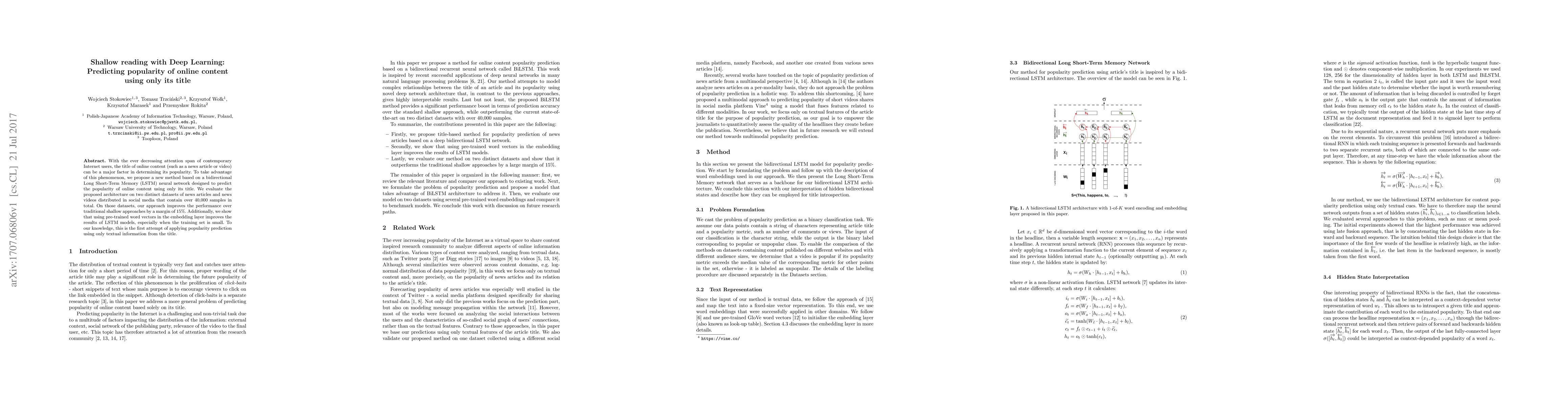 This paper proposes a bidirectional LSTM neural network to predict the popularity of online content based solely on its title, demonstrating a 15% improvement over traditional shallow methods. The use of pre-trained word vectors in the embedding layer further enhances the model's performance, especially with limited training data.