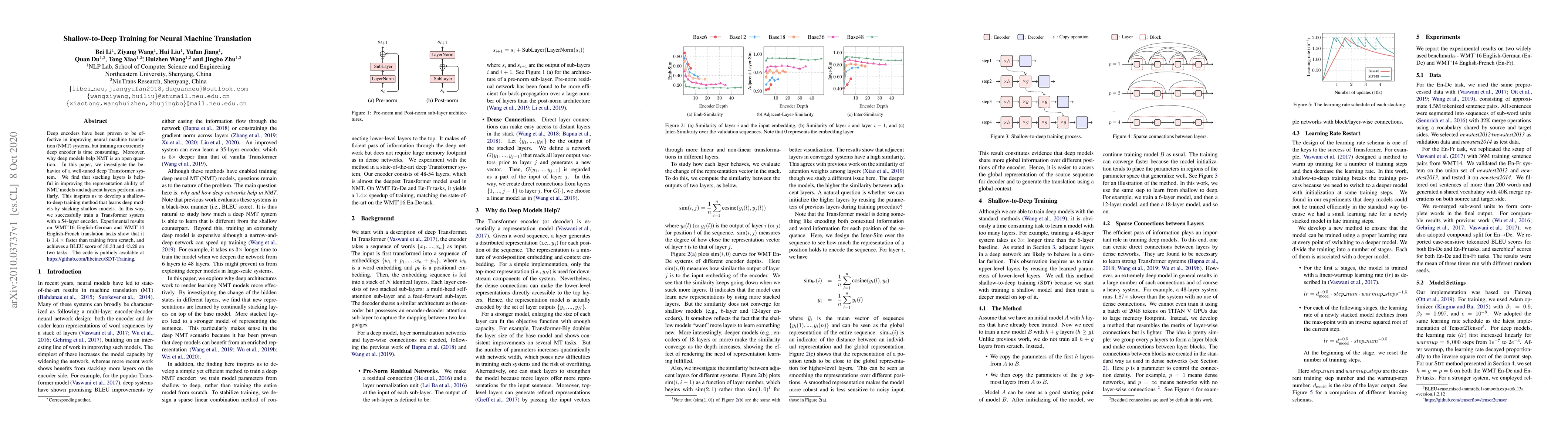 This paper proposes a shallow-to-deep training method for neural machine translation (NMT) that stacks shallow models to build a deep Transformer encoder, achieving a 54-layer model. The approach is $1.4$ times faster than training from scratch and attains BLEU scores of 30.33 and 43.29 on WMT'16 English-German and WMT'14 English-French datasets, respectively.