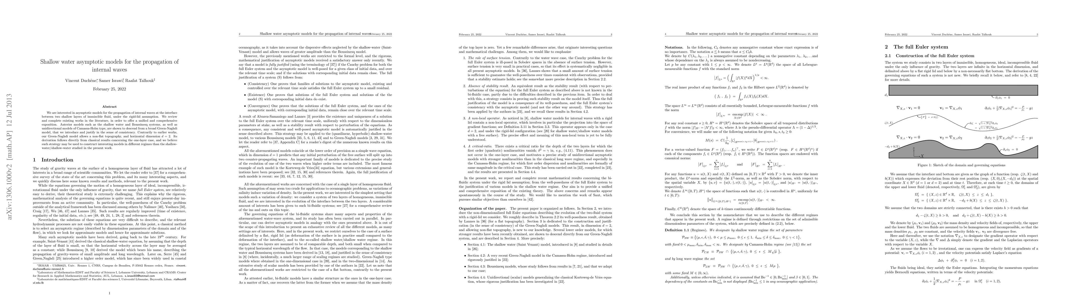 This paper develops an asymptotic model for internal wave propagation in shallow layers of immiscible fluid, deriving a comprehensive Green-Naghdi model that extends existing shallow water and Boussinesq models, and accommodates non-flat topography and two-dimensional horizontal dimensions.