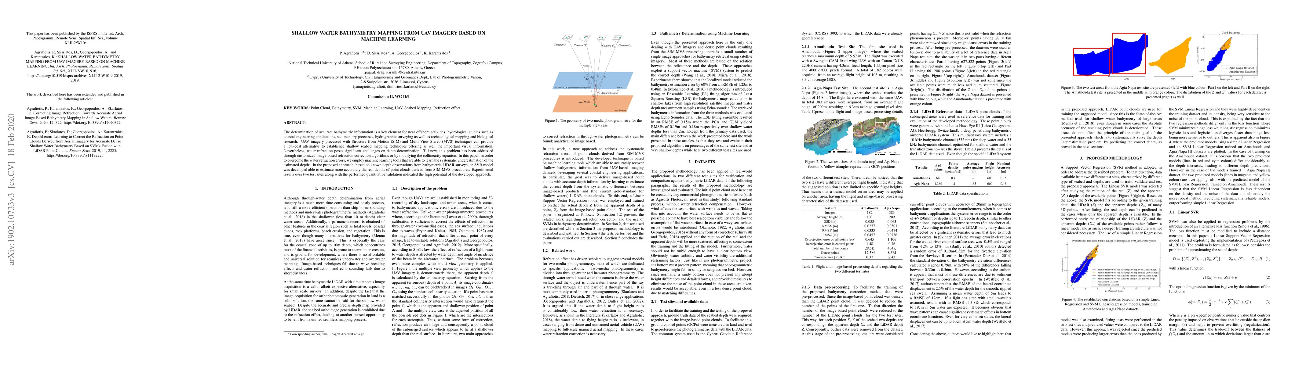 This paper proposes a machine learning method using Support Vector Regression (SVR) to correct for water refraction errors in shallow water bathymetry mapping from UAV imagery. The approach leverages known depth observations from bathymetric LiDAR surveys to develop an SVR model that accurately estimates real depths from Structure from Motion and Multi View Stereo techniques.