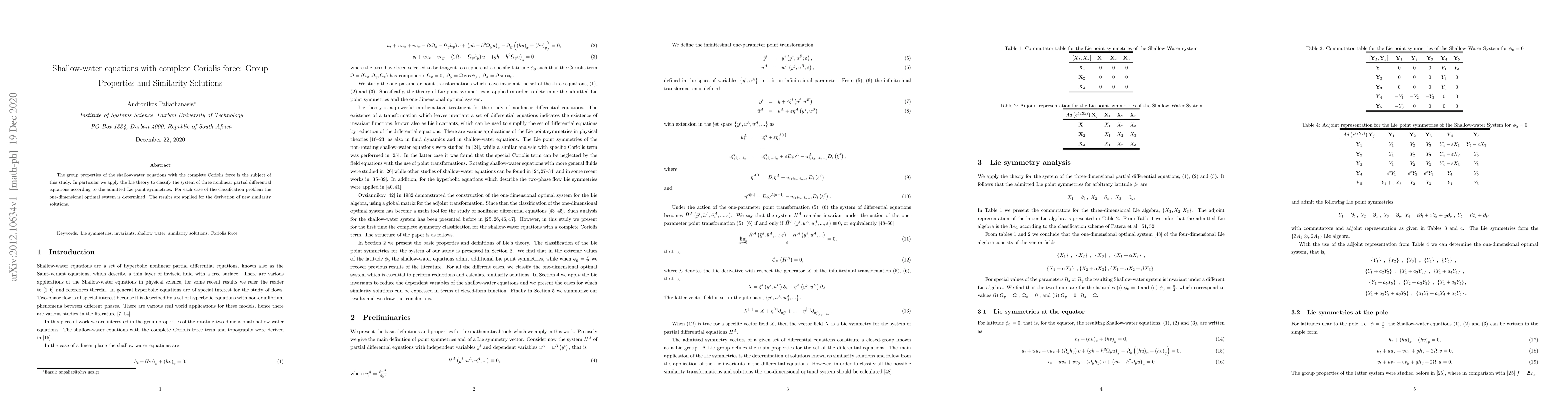 This paper investigates the group properties of shallow-water equations incorporating the full Coriolis force, utilizing Lie theory to classify the system based on admitted symmetries. New similarity solutions are derived from the classification results.