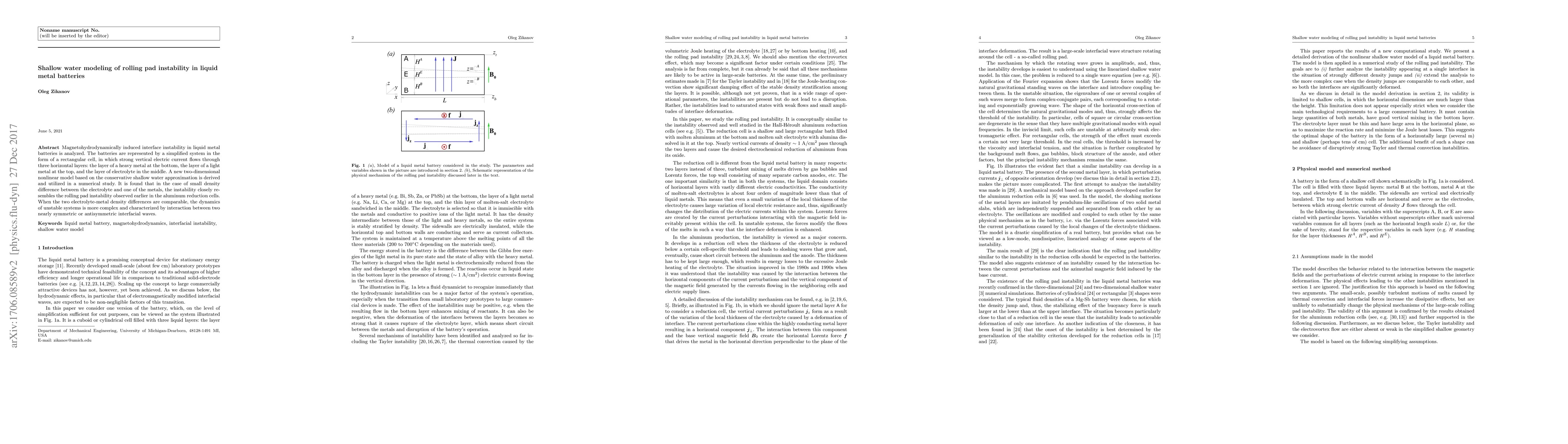 Magnetohydrodynamically induced interface instability in liquid metal batteries is analyzed. The batteries are represented by a simplified system in the form of a rectangular cell, in which strong vertical electric current flows through three horizontal layers: the layer of a heavy metal at the bottom, the layer of a light metal at the top, and the layer of electrolyte in the middle. A new two-dimensional nonlinear model based on the conservative shallow water approximation is derived and utilized in a numerical study. It is found that in the case of small density difference between the electrolyte and one of the metals, the instability closely resembles the rolling pad instability observed earlier in the aluminum reduction cells. When the two electrolyte-metal density differences are comparable, the dynamics of unstable systems is more complex and characterized by interaction between two nearly symmetric or antisymmetric interfacial waves.