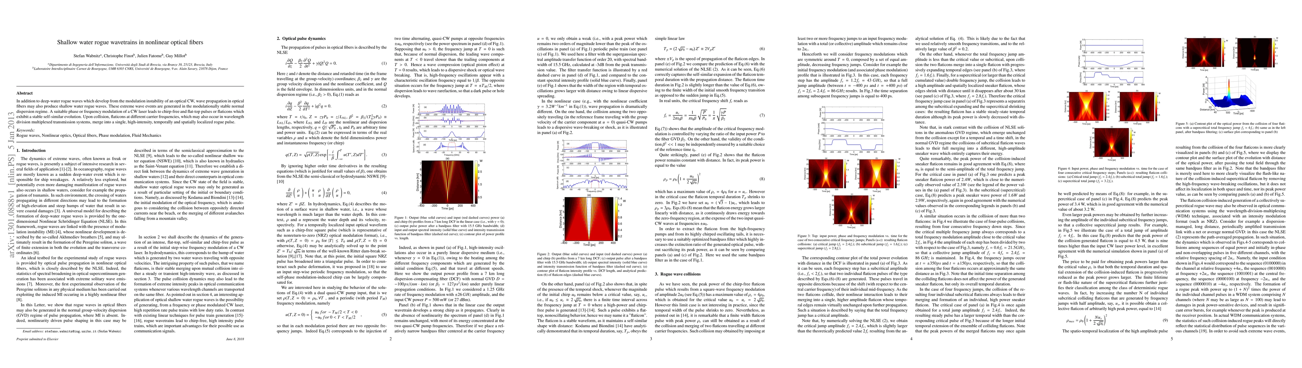 In addition to deep-water rogue waves which develop from the modulation instability of an optical CW, wave propagation in optical fibers may also produce shallow water rogue waves. These extreme wave events are generated in the modulationally stable normal dispersion regime. A suitable phase or frequency modulation of a CW laser leads to chirp-free and flat-top pulses or flaticons which exhibit a stable self-similar evolution. Upon collision, flaticons at different carrier frequencies, which may also occur in wavelength division multiplexed transmission systems, merge into a single, high-intensity, temporally and spatially localized rogue pulse.
