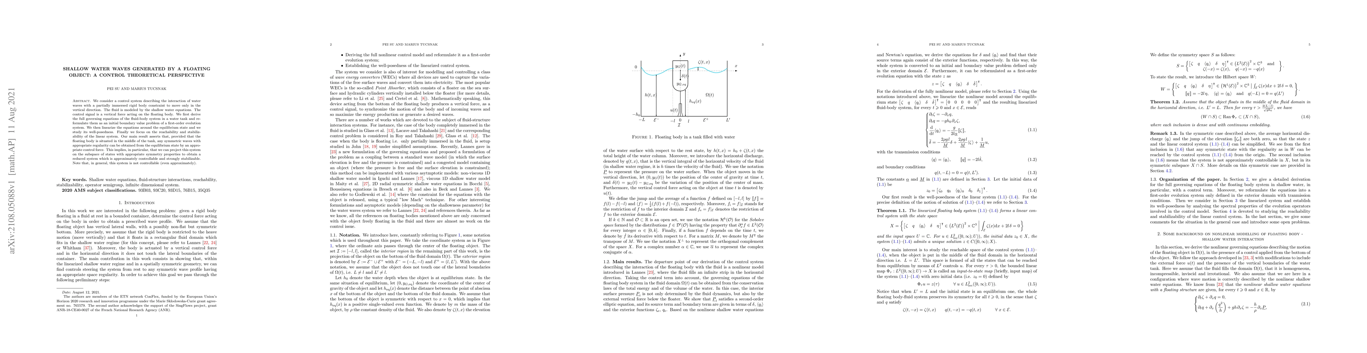 This paper studies a control system for shallow water waves generated by a vertically constrained floating object, deriving the governing equations and analyzing the system's well-posedness, reachability, and stabilizability. It concludes that symmetric waves can be generated by appropriate control forces, leading to a reduced controllable and stabilizable system.