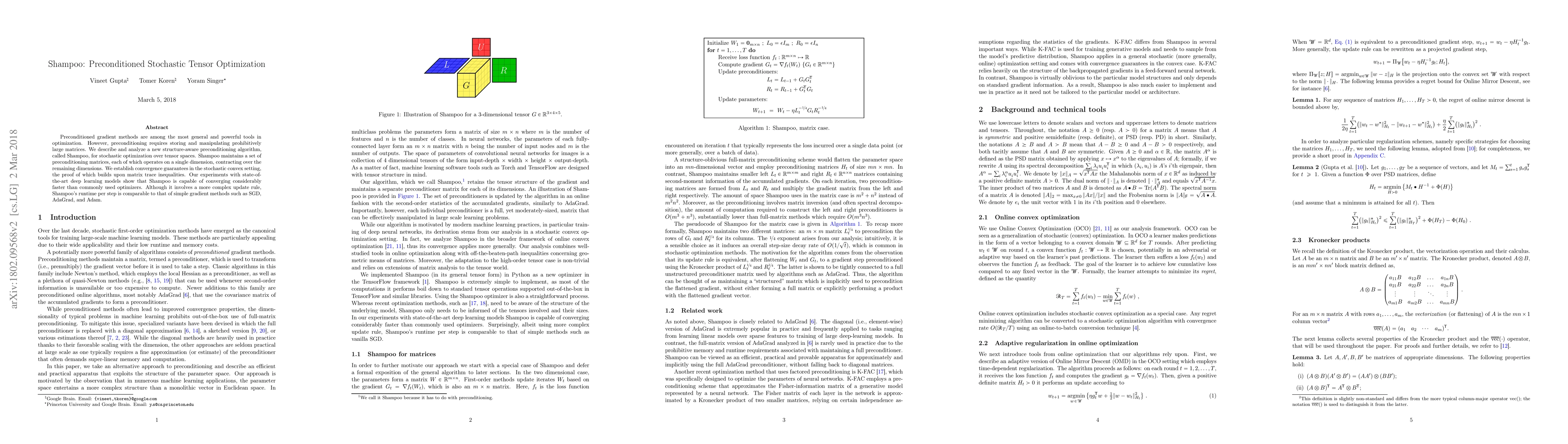 Shampoo is a novel preconditioning algorithm for stochastic tensor optimization that avoids the storage of large matrices by using dimension-specific preconditioning matrices. It demonstrates convergence guarantees in stochastic convex settings and outperforms standard optimizers in deep learning model training while maintaining comparable runtime per step.