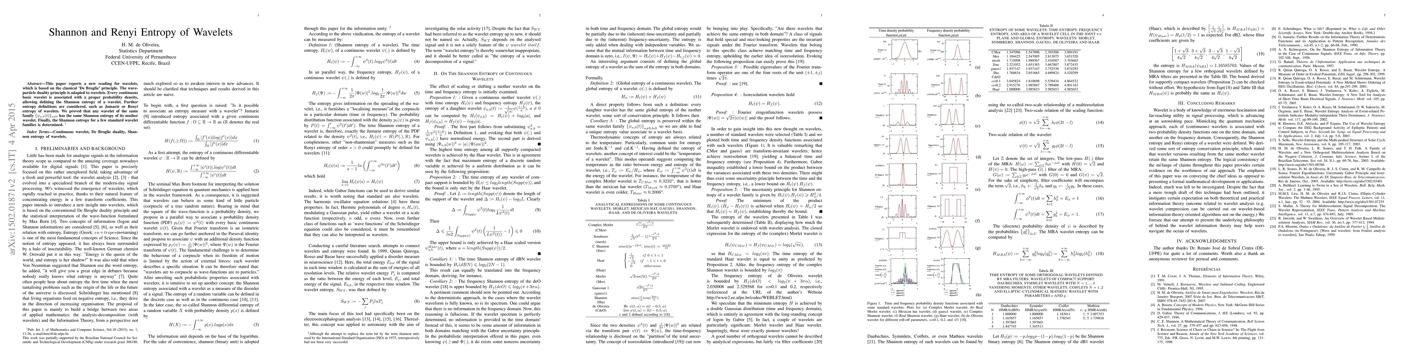This paper introduces a novel interpretation of wavelets based on the De Broglie principle, associating each continuous basic wavelet with a probability density to define Shannon entropy. It also explores Jumarie and Renyi entropy definitions and proves that wavelets within the same family share the same Shannon entropy as their mother wavelet.