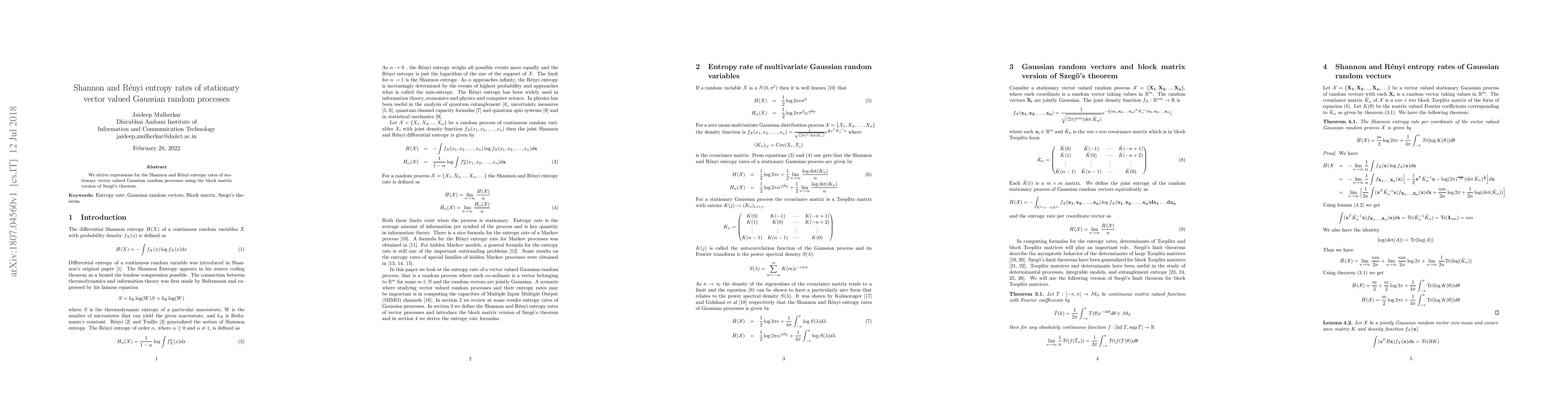 Summary: This paper derives expressions for the Shannon and Rényi entropy rates of stationary vector-valued Gaussian random processes, utilizing the block matrix version of Szegő's theorem for the analysis. The results provide insights into the information content of these processes.