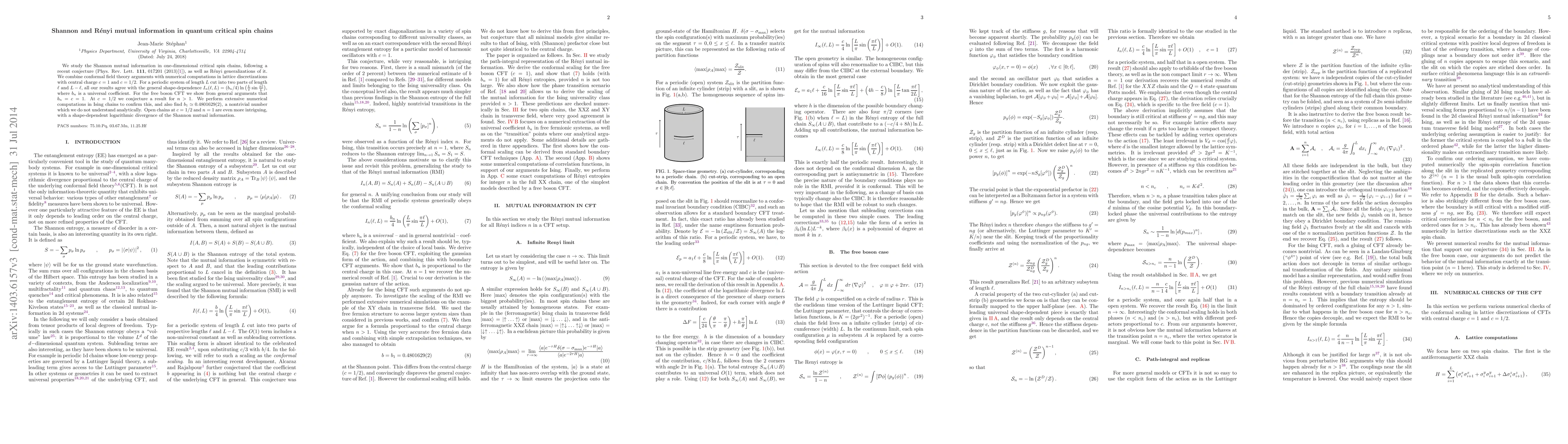 This paper investigates Shannon and Rényi mutual information in one-dimensional critical spin chains, combining conformal field theory and numerical simulations. Results support a universal shape-dependent logarithmic form, with $b_n=1$ for the free boson CFT and $b_1\simeq 0.4801629(2)$ numerically derived for $c=1/2$. Open chains exhibit a shape-dependent logarithmic divergence.