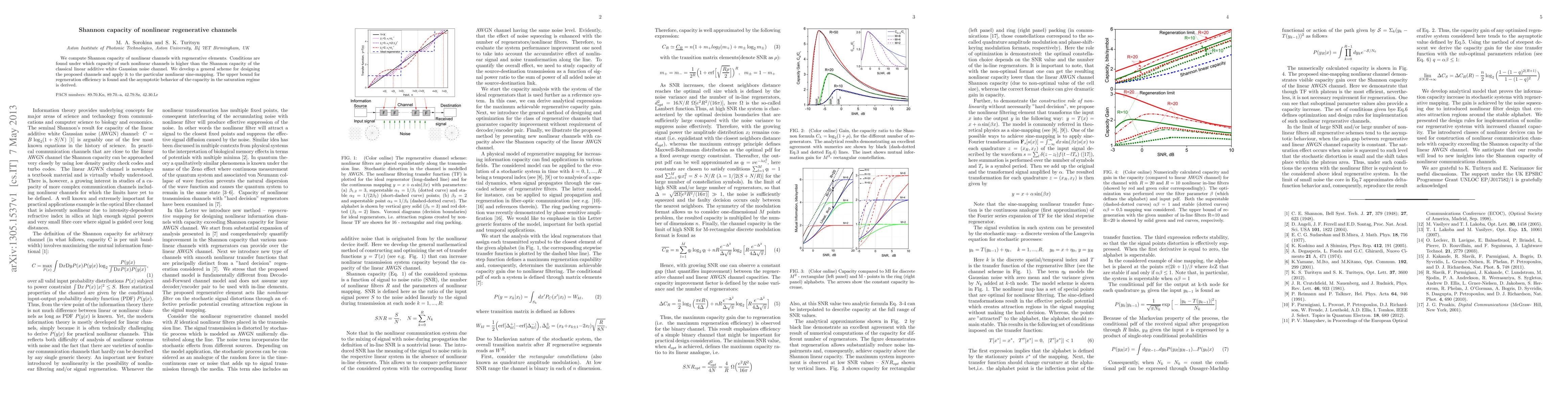 This paper computes the Shannon capacity of nonlinear regenerative channels, finding that under certain conditions, their capacity exceeds that of classical linear channels. It proposes a general design scheme for these channels and applies it to a nonlinear sine-mapping, deriving an upper bound for regeneration efficiency and the asymptotic capacity behavior in saturation.