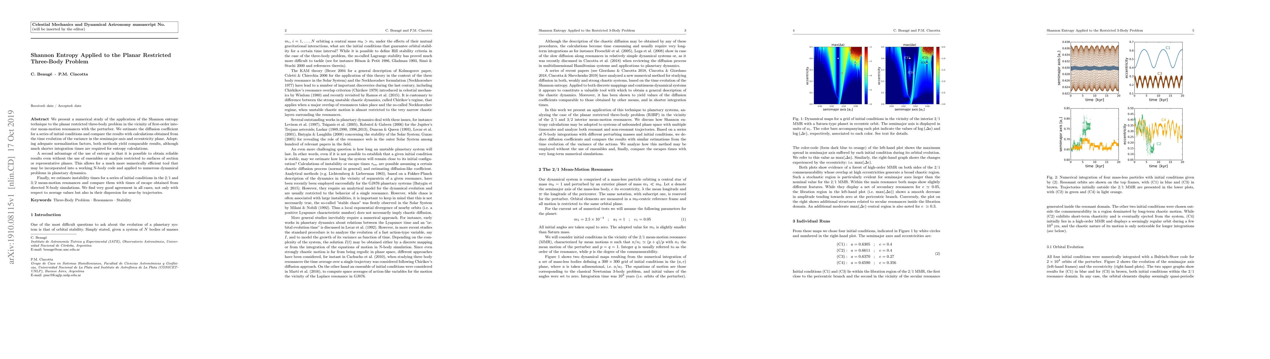 This paper applies Shannon entropy to study the planar restricted three-body problem, finding comparable results to traditional methods but with shorter integration times and greater numerical efficiency. It also estimates instability times for mean-motion resonances, showing good agreement with N-body simulations.