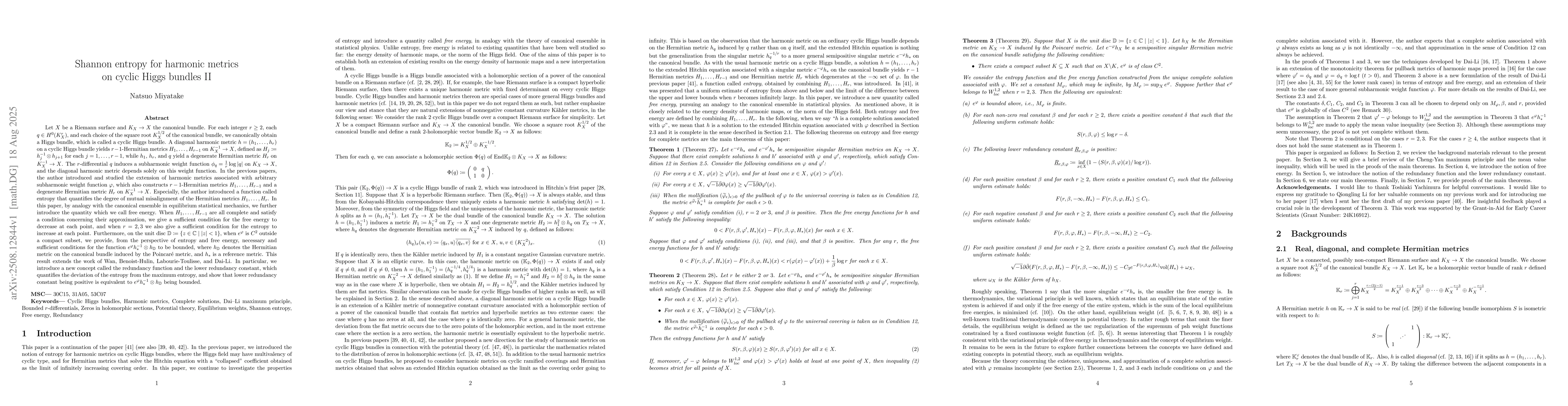 Let $X$ be a Riemann surface and $K_X \rightarrow X$ the canonical bundle. For each integer $r \geq 2$, each $q \in H^0(K_X^r)$, and each choice of the square root $K_X^{1/2}$ of the canonical bundle, we obtain a Higgs bundle, which is called a cyclic Higgs bundle. A diagonal harmonic metric $h = (h_1, \dots, h_r)$ on a cyclic Higgs bundle yields $r-1$-Hermitian metrics $H_1, \dots, H_{r-1}$ on $K_X^{-1} \rightarrow X$, while $h_1$, $h_r$, and $q$ yield a degenerate Hermitian metric $H_r$ on $K_X^{-1}\rightarrow X$. The $r$-differential $q$ induces a subharmonic weight function $\phi_q=\frac{1}{r}\log|q|$ on $K_X$, and the diagonal harmonic metric depends solely on this weight function. In the previous papers, the author studied the extension of harmonic metrics associated with arbitrary subharmonic weight function $\varphi$, which also constructs Hermitian metrics $H_1,\dots, H_r$ on $K_X^{-1}\rightarrow X$. Especially, the author introduced a function called entropy that quantifies the degree of mutual misalignment of the metrics $H_1,\dots, H_r$. In this paper, by analogy with the canonical ensemble in statistical mechanics, we further introduce the quantity which we call free energy. When $H_1,\dots, H_{r-1}$ are all complete and satisfy a condition concerning their approximation, we give a sufficient condition for the free energy to decrease at each point, and when $r=2,3$ we also give a sufficient condition for the entropy to increase at each point. Furthermore, on the unit disc $\mathbb{D}$, when is $C^2$ outside a compact subset, we provide, from the perspective of entropy and free energy, necessary and sufficient conditions for the function $e^\varphi h_\ast^{-1} \otimes h_{\mathbb{D}}$ to be bounded, where $h_{\mathbb{D}}$ denotes the Hermitian metric induced by the Poincar\'e metric. This result extends the work of Wan, Benoist-Hulin, Labourie-Toulisse, and Dai-Li.