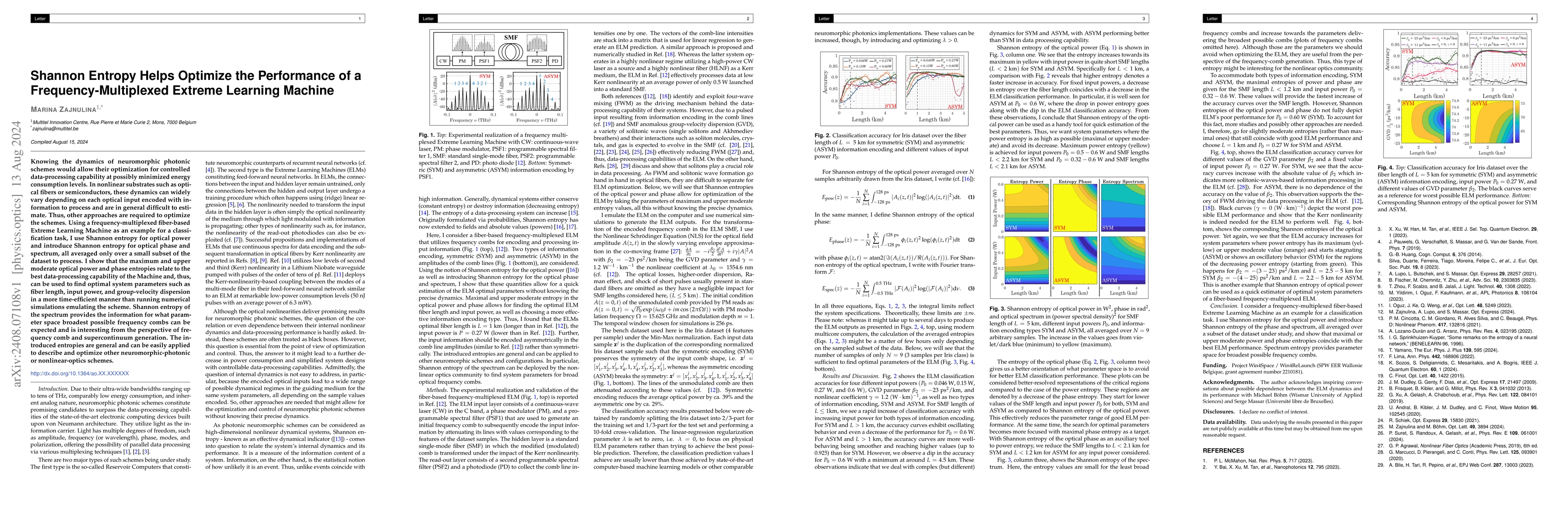 This paper demonstrates that Shannon entropy applied to optical power, phase, and spectrum can optimize a frequency-multiplexed Extreme Learning Machine's performance, enabling more efficient tuning of system parameters like fiber length and input power. The use of Shannon entropy provides a faster alternative to numerical simulations for optimizing neuromorphic photonic schemes.