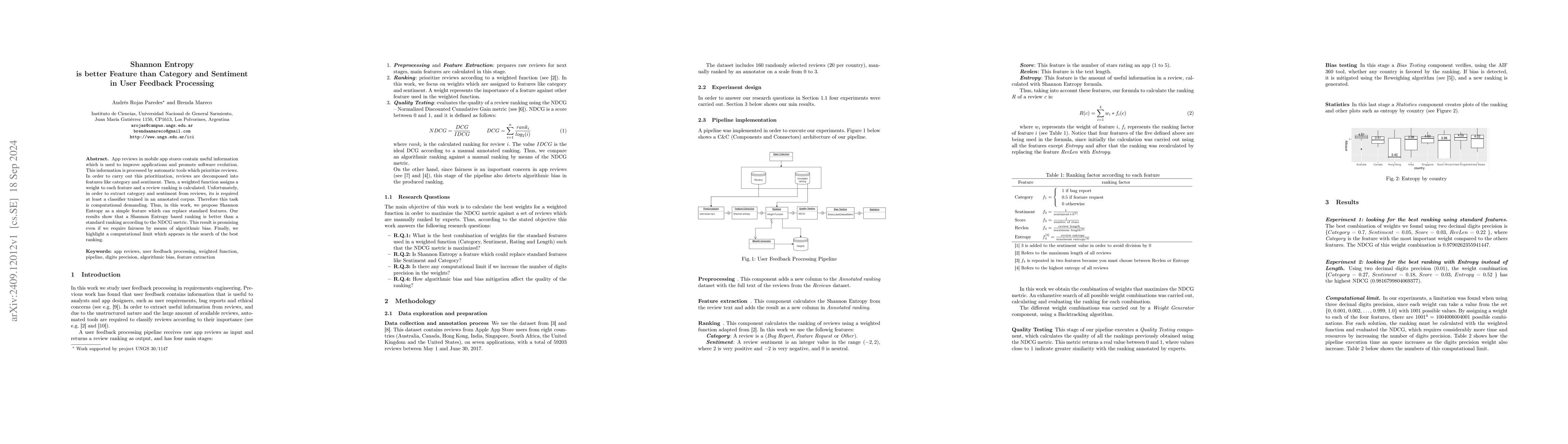 Title: Shannon Entropy is better Feature than Category and Sentiment in User Feedback Processing Summary: This study proposes using Shannon Entropy instead of category and sentiment features in processing app reviews, demonstrating that it yields better ranking performance according to the NDCG metric while reducing computational demands and algorithmic bias.