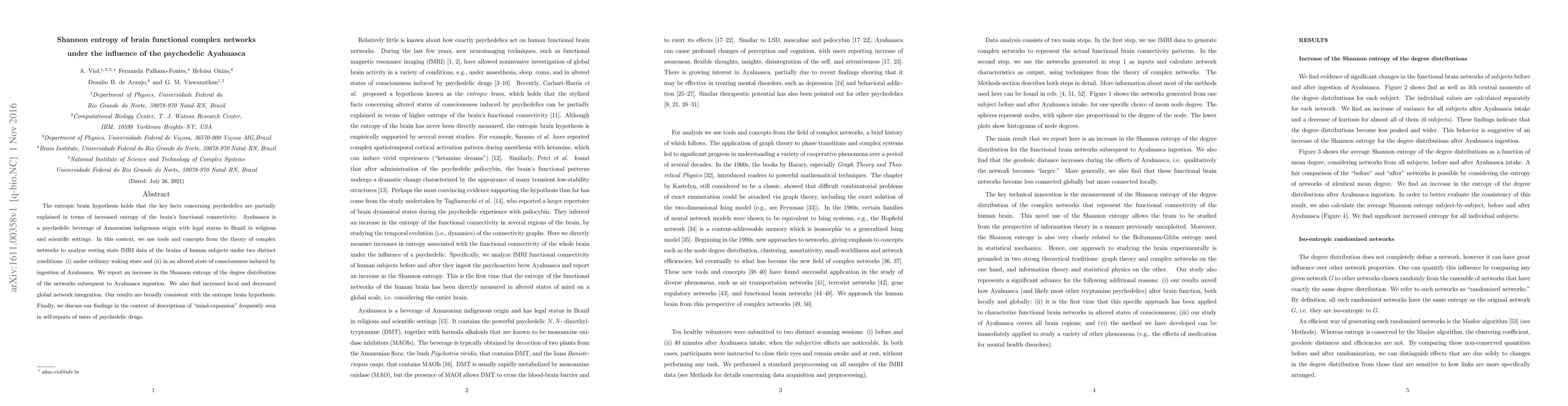 This study investigates the impact of Ayahuasca on brain functional connectivity using resting state fMRI data, finding increased Shannon entropy in the networks after ingestion, supporting the entropic brain hypothesis and suggesting enhanced local integration and reduced global network integration.