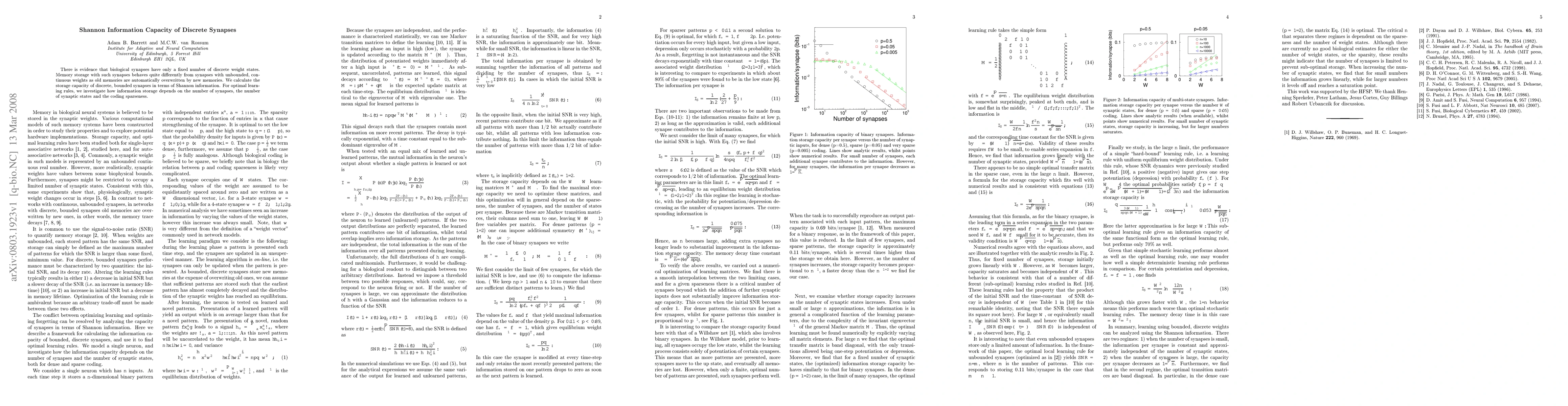 This paper calculates the Shannon information capacity of discrete synapses with fixed weight states, contrasting their memory storage behavior with continuous synapses. It explores how optimal learning rules affect storage capacity based on synapse count, synaptic states, and coding sparseness.