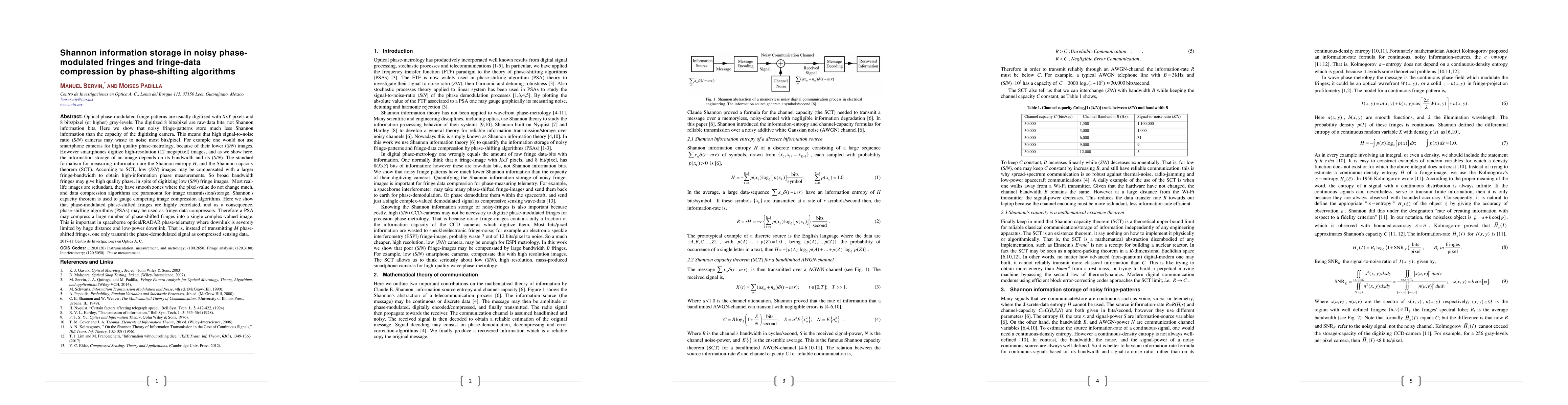 Optical phase-modulated fringe-patterns are usually digitized with XxY pixels and 8 bits/pixel (or higher) gray-levels. The digitized 8 bits/pixel are raw-data bits, not Shannon information bits. Here we show that noisy fringe-patterns store much less Shannon information than the capacity of the digitizing camera. This means that high signal-to-noise ratio (S/N) cameras may waste to noise most bits/pixel. For example one would not use smartphone cameras for high quality phase-metrology, because of their lower (S/N) images. However smartphones digitize high-resolution (12 megapixel) images, and as we show here, the information storage of an image depends on its bandwidth and its (S/N). The standard formalism for measuring information are the Shannon-entropy H, and the Shannon capacity theorem (SCT). According to SCT, low (S/N) images may be compensated with a larger fringe-bandwidth to obtain high-information phase measurements. So broad bandwidth fringes may give high quality phase, in spite of digitizing low (S/N) fringe images. Most real-life images are redundant, they have smooth zones where the pixel-value do not change much, and data compression algorithms are paramount for image transmission/storage. Shannon's capacity theorem is used to gauge competing image compression algorithms. Here we show that phase-modulated phase-shifted fringes are highly correlated, and as a consequence, phase-shifting algorithms (PSAs) may be used as fringe-data compressors. Therefore a PSA may compress a large number of phase-shifted fringes into a single complex-valued image. This is important in spaceborne optical/RADAR phase-telemetry where downlink is severely limited by huge distance and low-power downlink. That is, instead of transmitting M phase-shifted fringes, one only transmit the phase-demodulated signal as compressed sensing data.
