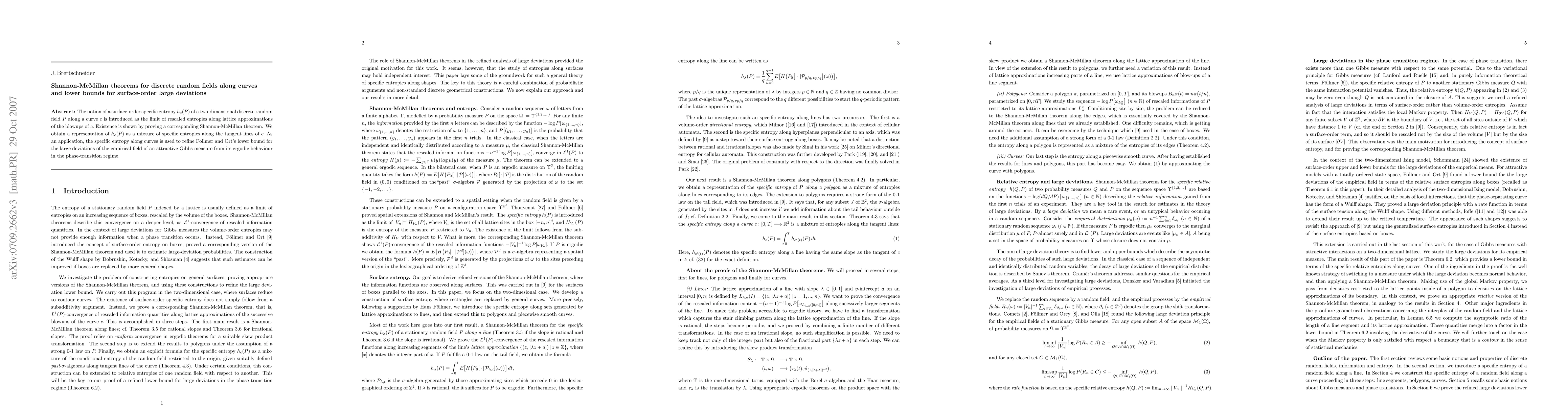 The notion of a surface-order specific entropy h_c(P) of a two-dimensional discrete random field P along a curve c is introduced as the limit of rescaled entropies along lattice approximations of the blowups of c. Existence is shown by proving a corresponding Shannon-McMillan theorem. We obtain a representation of h_c(P) as a mixture of specific entropies along the tangent lines of c. As an application, the specific entropy along curves is used to refine Foellmer and Ort's lower bound for the large deviations of the empirical field of an attractive Gibbs measure from its ergodic behavior in the phase-transition regime.