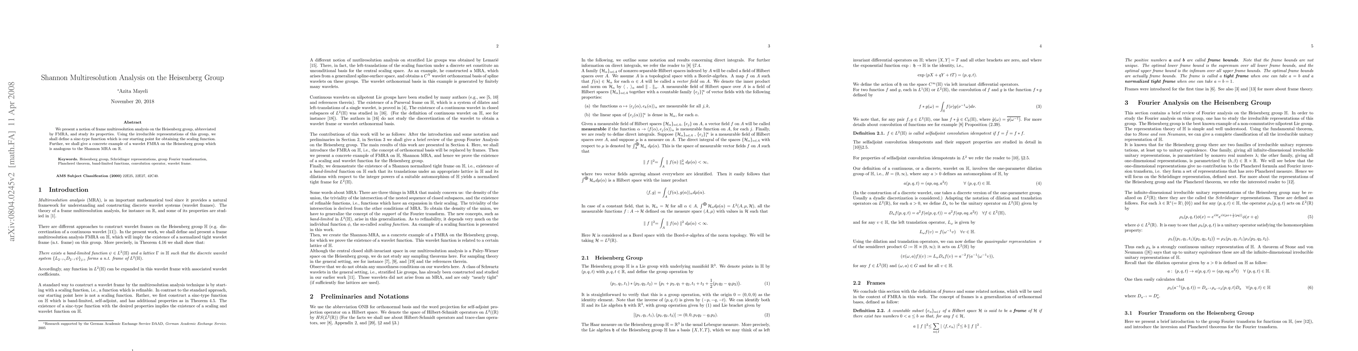 We present a notion of frame multiresolution analysis on the Heisenberg group, abbreviated by FMRA, and study its properties. Using the irreducible representations of this group, we shall define a sinc-type function which is our starting point for obtaining the scaling function. Further, we shall give a concrete example of a wavelet FMRA on the Heisenberg group which is analogous to the Shannon MRA on $\RR$.
