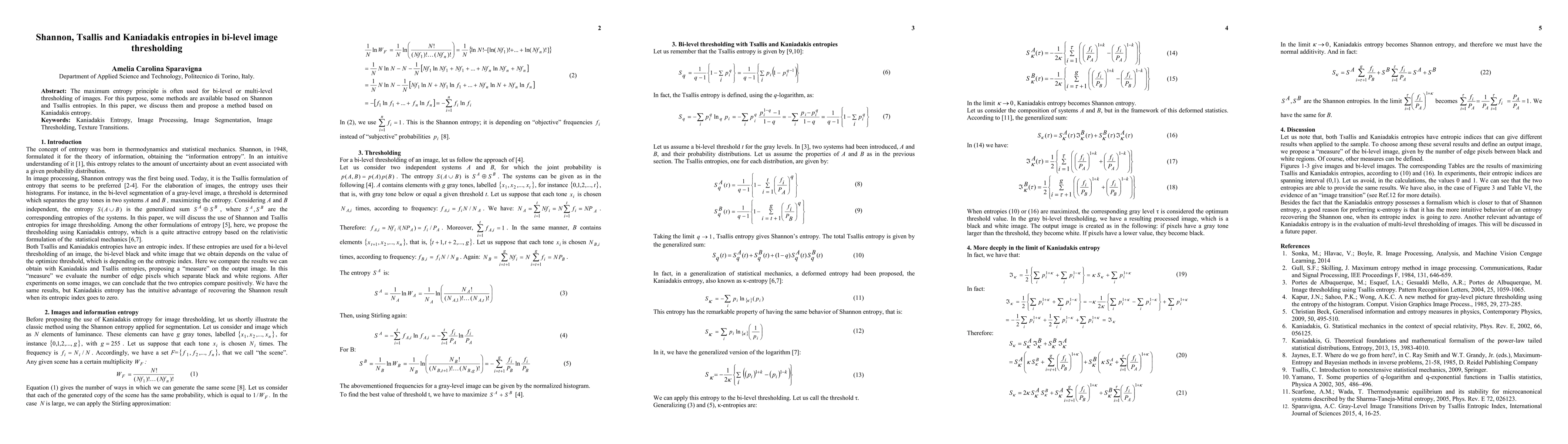 This paper compares bi-level image thresholding methods using Shannon and Tsallis entropies and proposes a novel approach based on Kaniadakis entropy to maximize entropy for improved image segmentation.