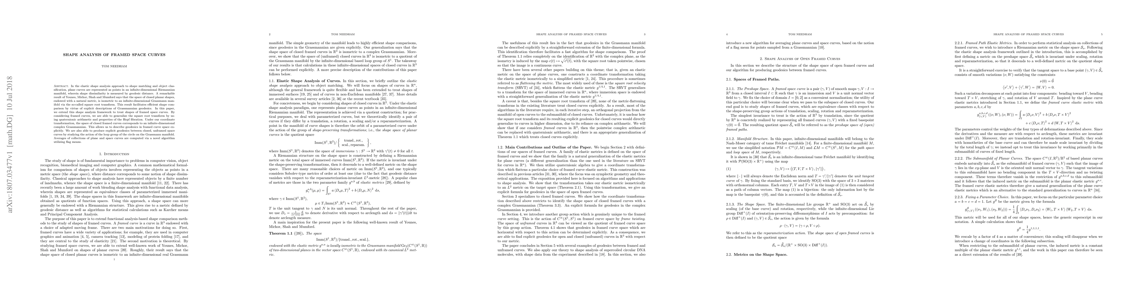 This paper extends shape analysis techniques from planar to framed space curves by leveraging quaternionic arithmetic and the Hopf fibration. It introduces an infinite-dimensional complex Grassmannian representation for framed curves, enabling explicit geodesic computations and novel flag mean algorithms for curve averaging.