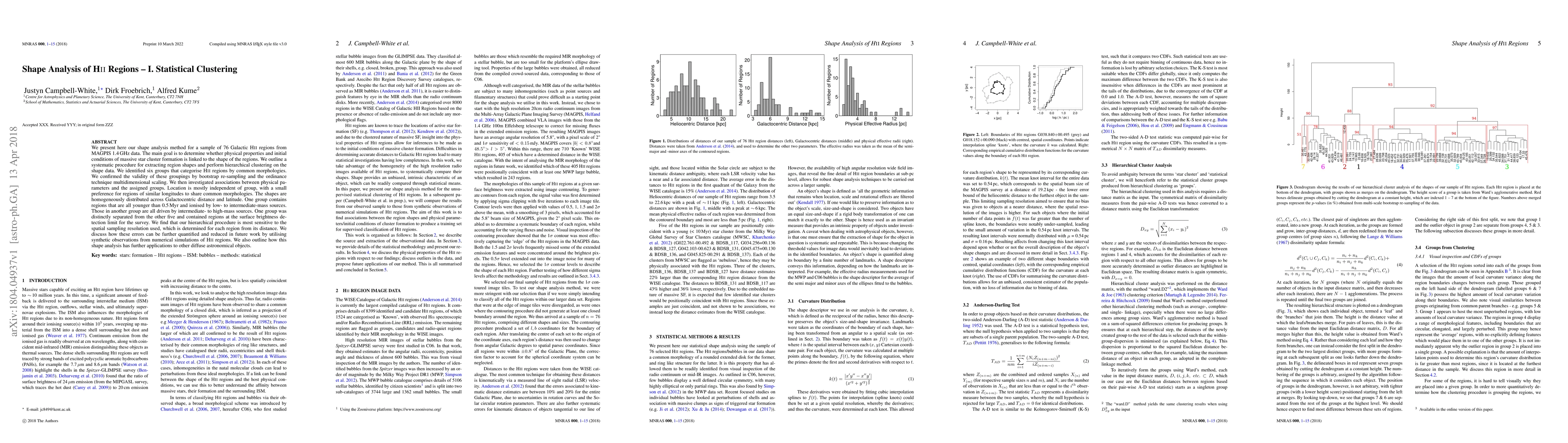 We present here our shape analysis method for a sample of 76 Galactic HII regions from MAGPIS 1.4 GHz data. The main goal is to determine whether physical properties and initial conditions of massive star cluster formation is linked to the shape of the regions. We outline a systematic procedure for extracting region shapes and perform hierarchical clustering on the shape data. We identified six groups that categorise HII regions by common morphologies. We confirmed the validity of these groupings by bootstrap re-sampling and the ordinance technique multidimensional scaling. We then investigated associations between physical parameters and the assigned groups. Location is mostly independent of group, with a small preference for regions of similar longitudes to share common morphologies. The shapes are homogeneously distributed across Galactocentric distance and latitude. One group contains regions that are all younger than 0.5 Myr and ionised by low- to intermediate-mass sources. Those in another group are all driven by intermediate- to high-mass sources. One group was distinctly separated from the other five and contained regions at the surface brightness detection limit for the survey. We find that our hierarchical procedure is most sensitive to the spatial sampling resolution used, which is determined for each region from its distance. We discuss how these errors can be further quantified and reduced in future work by utilising synthetic observations from numerical simulations of HII regions. We also outline how this shape analysis has further applications to other diffuse astronomical objects.