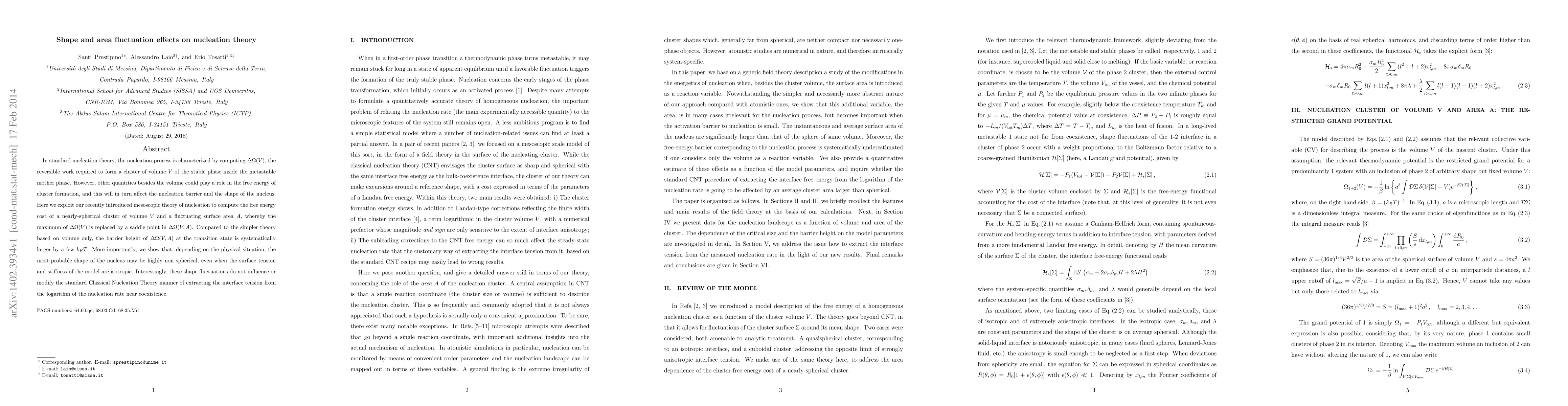 This paper explores how shape and area fluctuations influence nucleation theory, showing that considering both volume and fluctuating surface area in the free energy cost leads to a higher nucleation barrier and non-spherical nucleus shapes, without altering the method for extracting interface tension from nucleation rates.