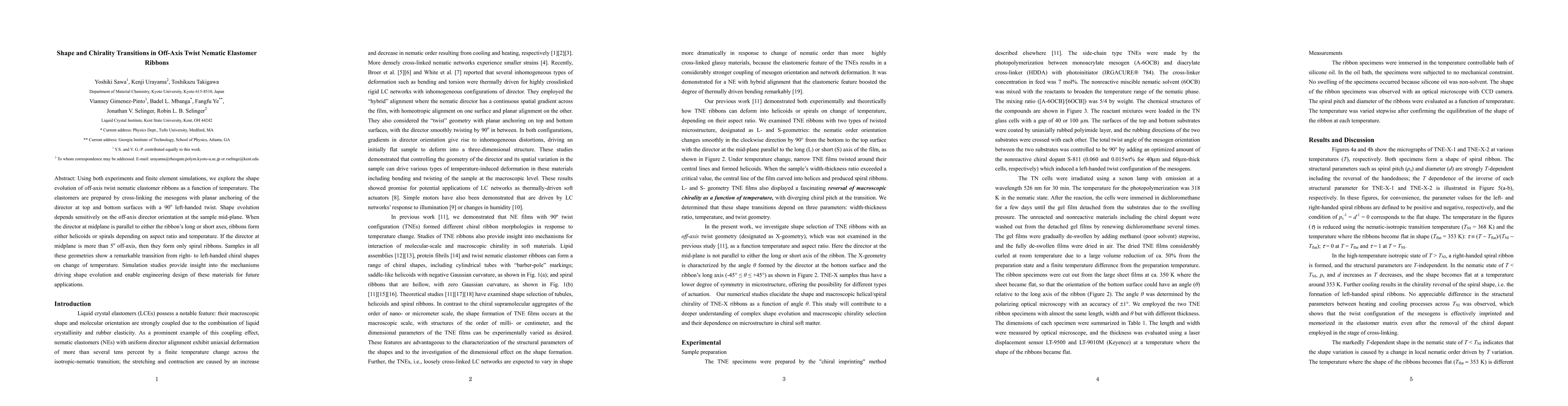This study investigates the shape transitions in off-axis twist nematic elastomer ribbons through experiments and simulations, revealing that ribbon geometry and temperature dictate whether they form helicoids, spirals, or chiral shapes. The research highlights the influence of director orientation and temperature on the material's shape evolution.