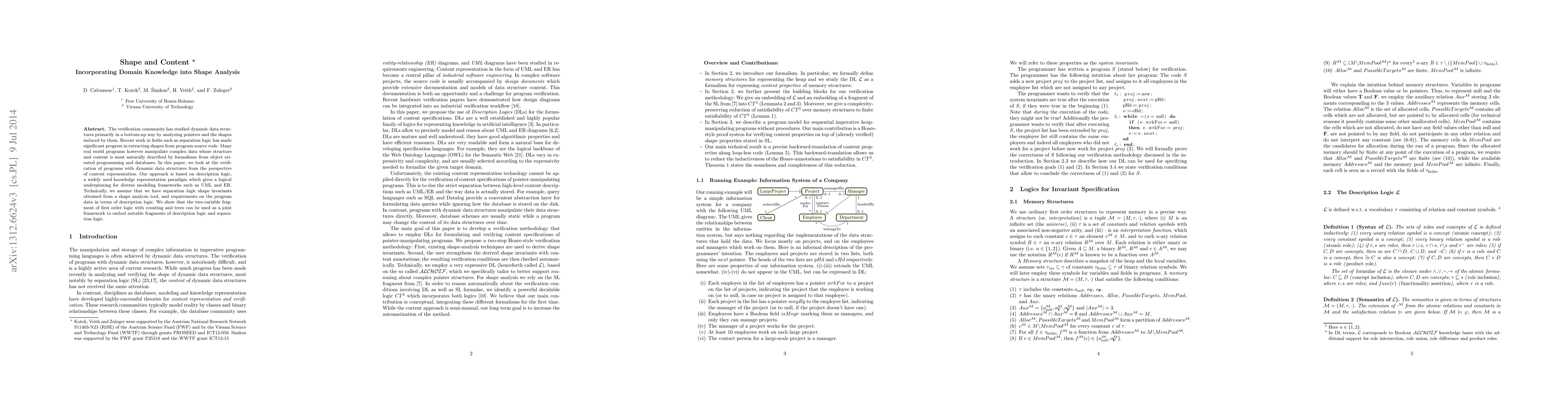 The verification community has studied dynamic data structures primarily in a bottom-up way by analyzing pointers and the shapes induced by them. Recent work in fields such as separation logic has made significant progress in extracting shapes from program source code. Many real world programs however manipulate complex data whose structure and content is most naturally described by formalisms from object oriented programming and databases. In this paper, we look at the verification of programs with dynamic data structures from the perspective of content representation. Our approach is based on description logic, a widely used knowledge representation paradigm which gives a logical underpinning for diverse modeling frameworks such as UML and ER. Technically, we assume that we have separation logic shape invariants obtained from a shape analysis tool, and requirements on the program data in terms of description logic. We show that the two-variable fragment of first order logic with counting and trees %(whose decidability was proved at LICS 2013) can be used as a joint framework to embed suitable fragments of description logic and separation logic.