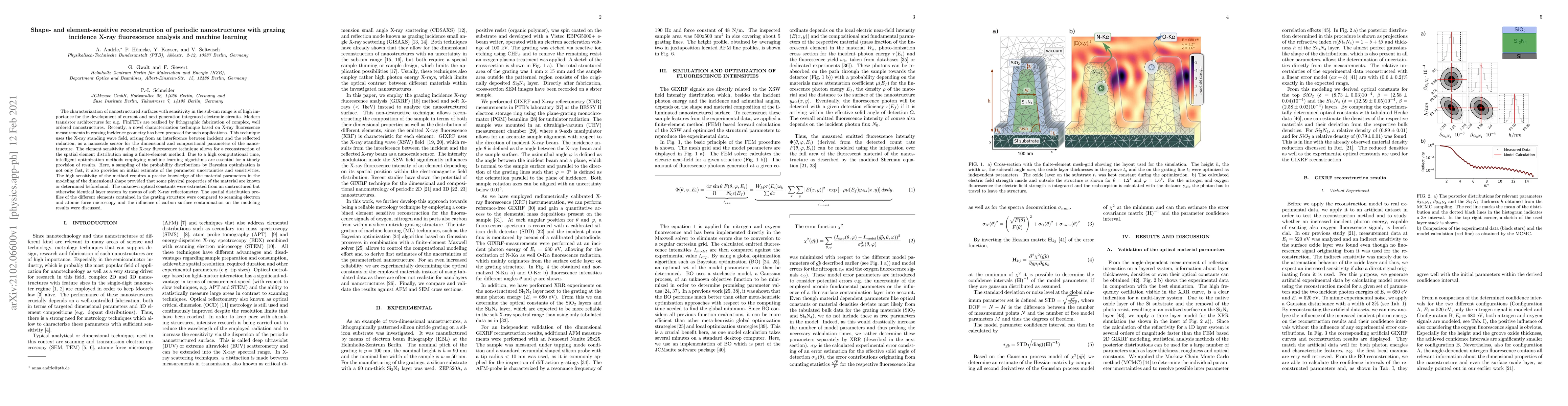 This paper proposes a novel technique using grazing incidence X-ray fluorescence analysis and machine learning to characterize nanostructured surfaces with sub-nm sensitivity, crucial for advanced electronic circuits. The method employs X-ray standing wave fields and Bayesian optimization to efficiently reconstruct the spatial element distribution, validated against microscopy techniques.