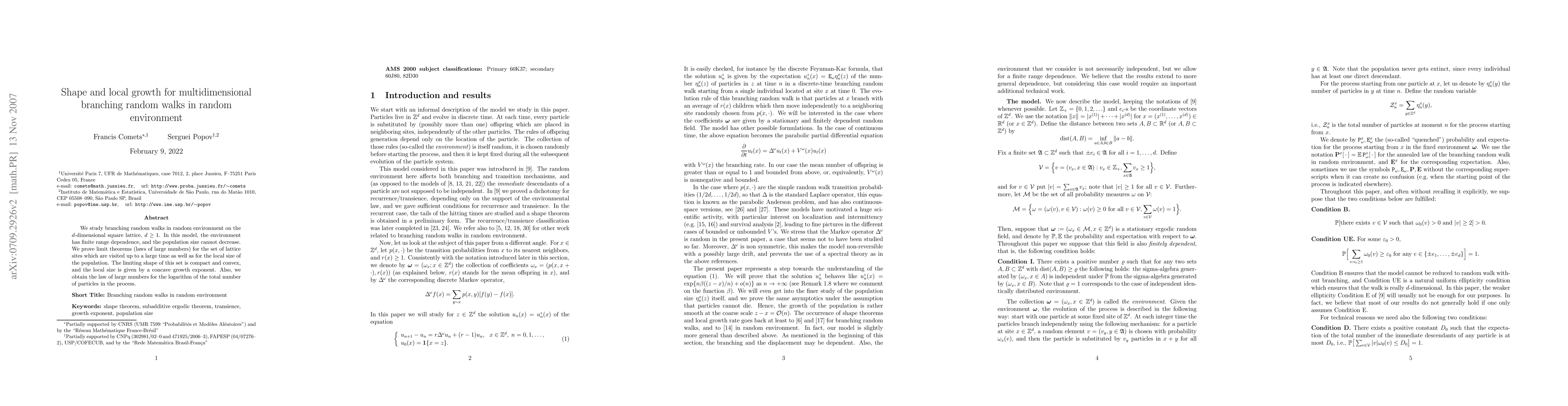 This paper investigates branching random walks on the $d$-dimensional square lattice with random environment, proving limit theorems for visited sites and local population sizes. The limiting shape of visited sites is compact and convex, while the local size follows a concave growth exponent.