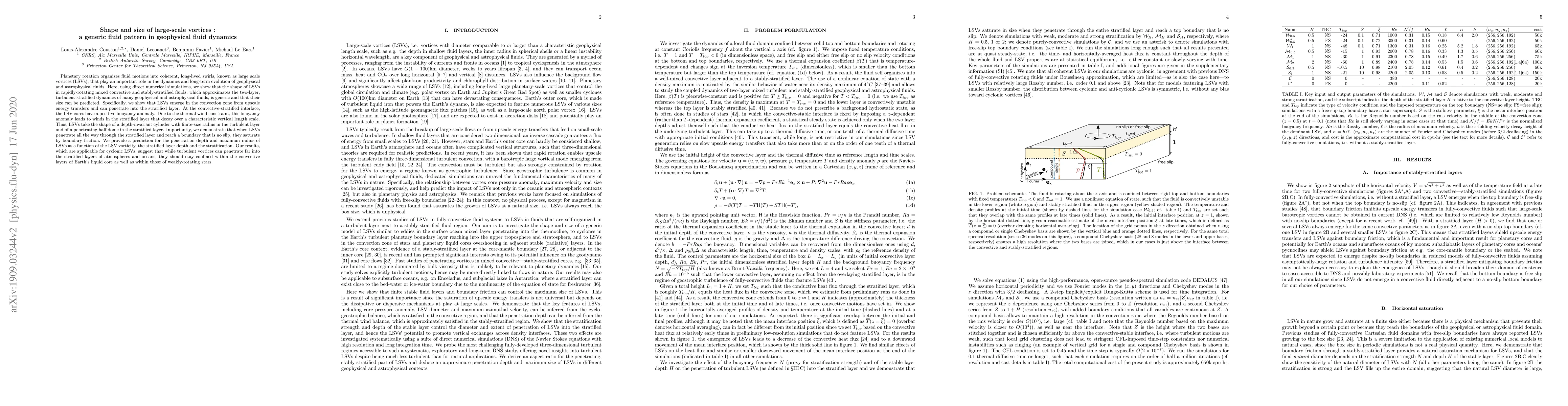 This paper uses direct numerical simulations to demonstrate that large-scale vortices (LSVs) in rapidly rotating, mixed convective and stably stratified fluids exhibit a generic shape and predictable size. The study reveals that LSVs form from upscale energy transfers and can penetrate into stratified layers, taking the shape of a depth-invariant cylinder in the turbulent layer and a half dome in the stratified layer.