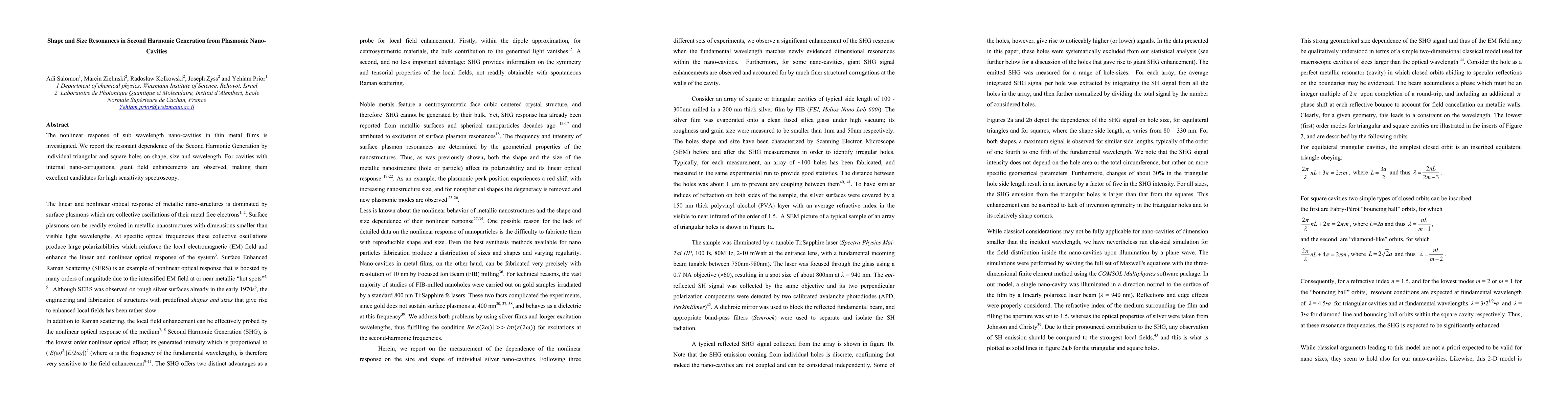 The nonlinear response of sub wavelength nano-cavities in thin metal films is investigated. We report the resonant dependence of the Second Harmonic Generation by individual triangular and square holes on shape, size and wavelength. For cavities with internal nano-corrugations, giant field enhancements are observed, making them excellent candidates for high sensitivity spectroscopy.