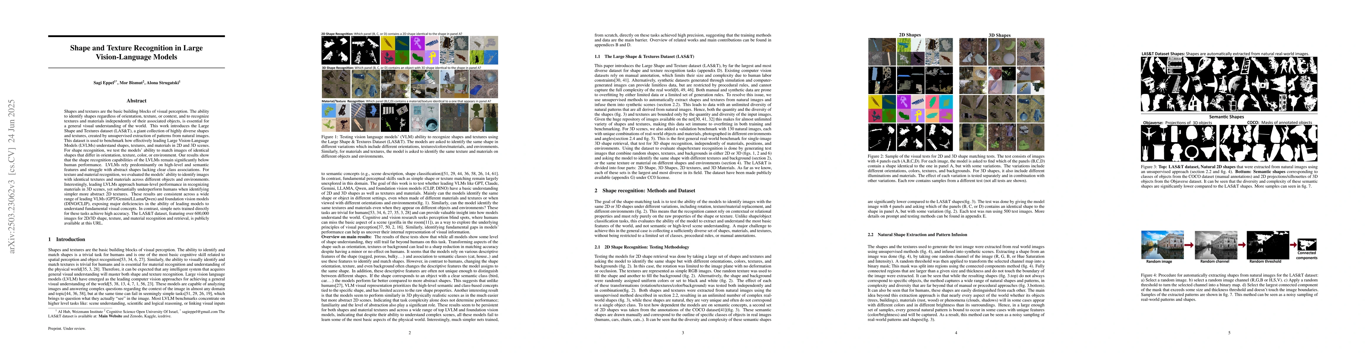 The research introduces the Large Shape and Textures dataset (LAS&T), created by unsupervised extraction of patterns from natural images, to benchmark leading Large Vision-Language Models (LVLMs) on shape and texture recognition tasks in 2D and 3D scenes.