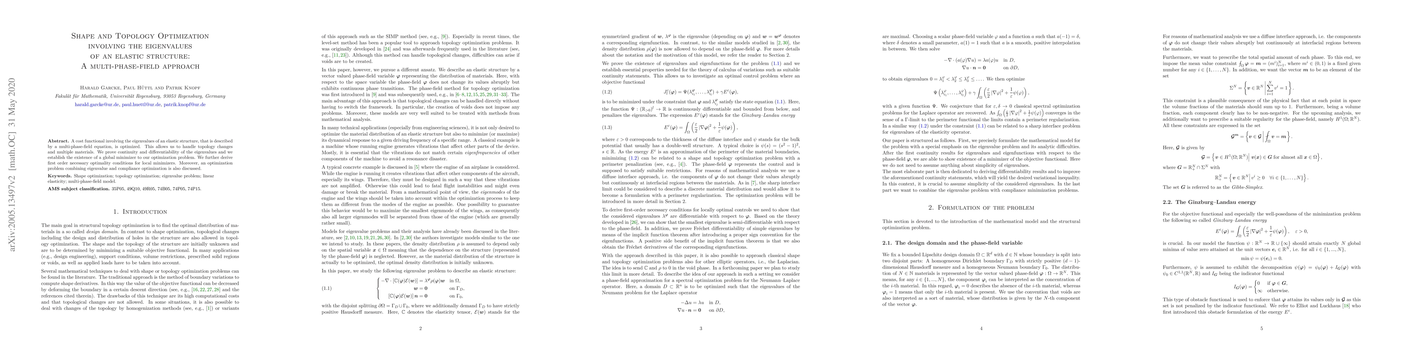 Researchers developed a method to optimize the shape and topology of elastic structures using eigenvalues, which can handle multiple materials and changes in material properties. They established the existence of global minimizers and derived necessary conditions for local optimality.