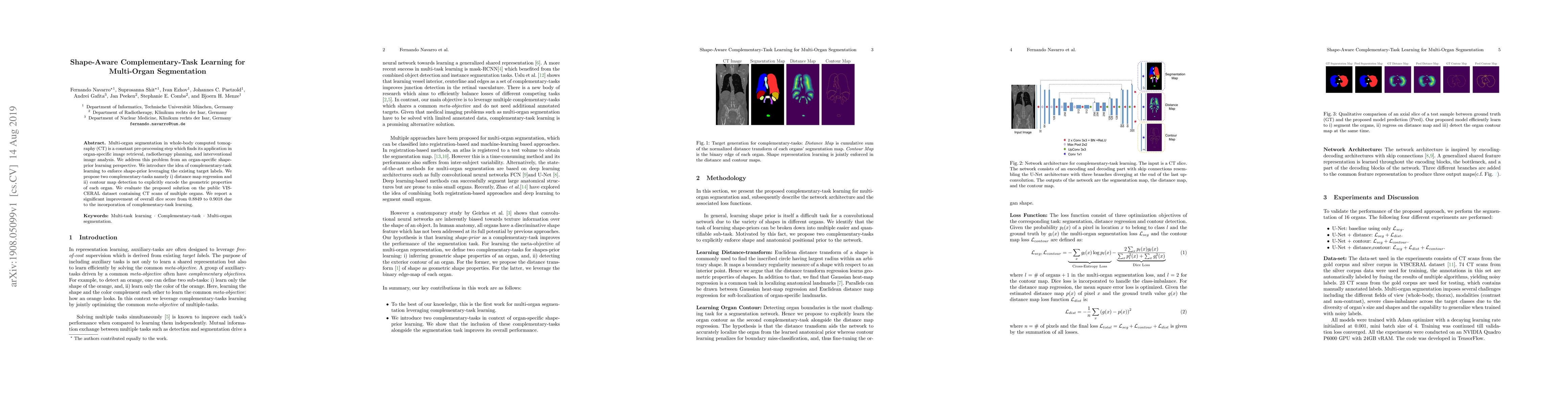 This paper proposes a shape-aware complementary-task learning approach for multi-organ segmentation in CT scans, introducing distance map regression and contour map detection to encode organ geometries. The method shows a notable improvement in segmentation accuracy, raising the overall dice score from 0.8849 to 0.9018 on the VISCERAL dataset.