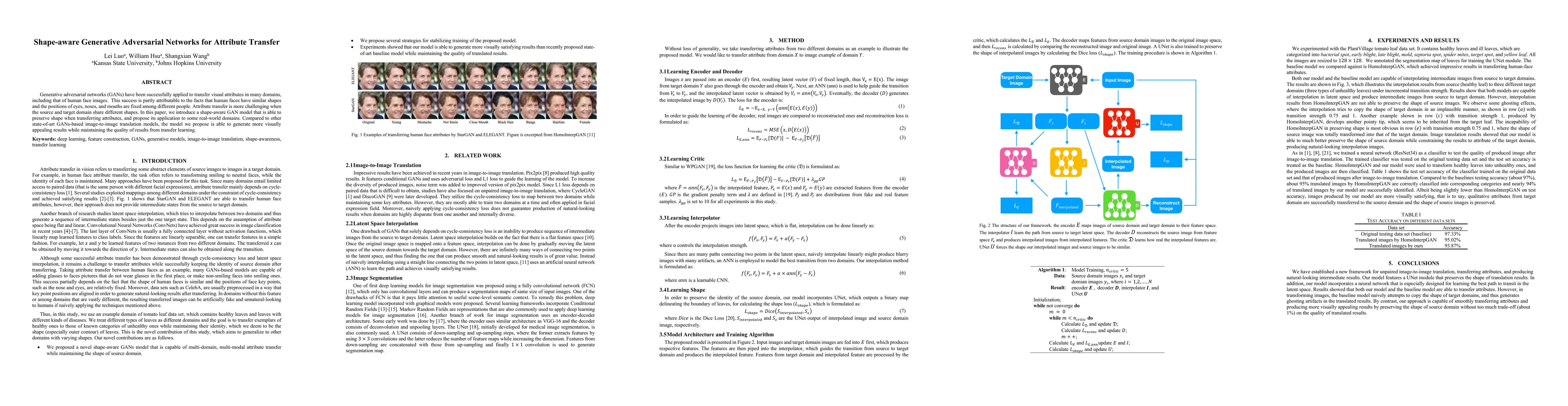 This paper introduces a shape-aware Generative Adversarial Network (GAN) model that preserves shape during attribute transfer, producing more visually appealing results while maintaining quality.